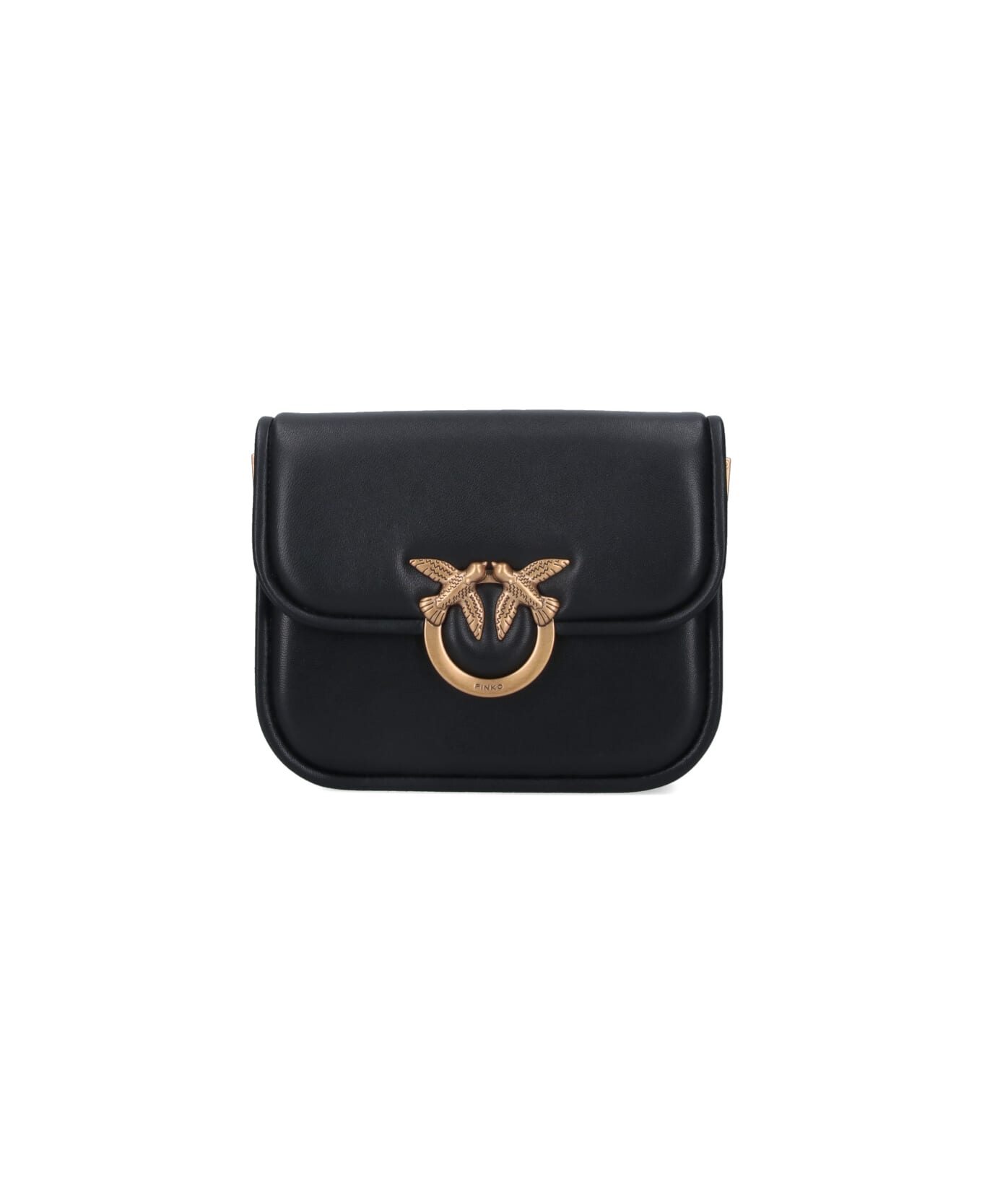 Pinko mini Love Box Bag bag in black nappa leather with adjustable and removable shoulder strap, magnetic flap closure, gold metal "Love Birds Diamond Cut" logo detail, back logo stitching, inner zip pocket, main inner compartment.