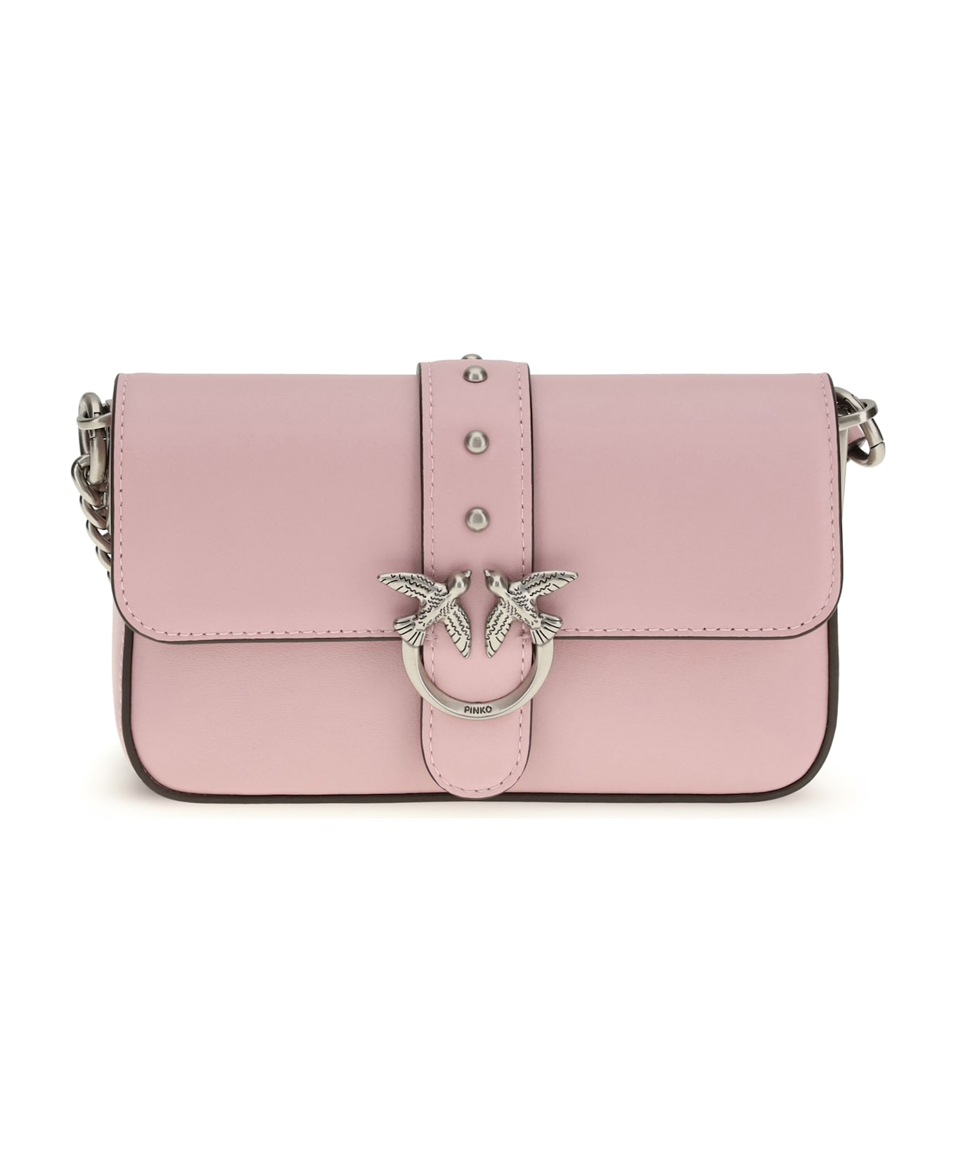 The baby love shoulder bag by pinko is an iconic and versatile accessory featuring an adjustable leather shoulder strap with buckle and a chain strap with leather shoulder strap to suit different style needs. the flap closure is embellished with the pod and buckle featuring the iconic love birds diamond cut logo in antique gold plated metal, giving it a distinctive and elegant touch.