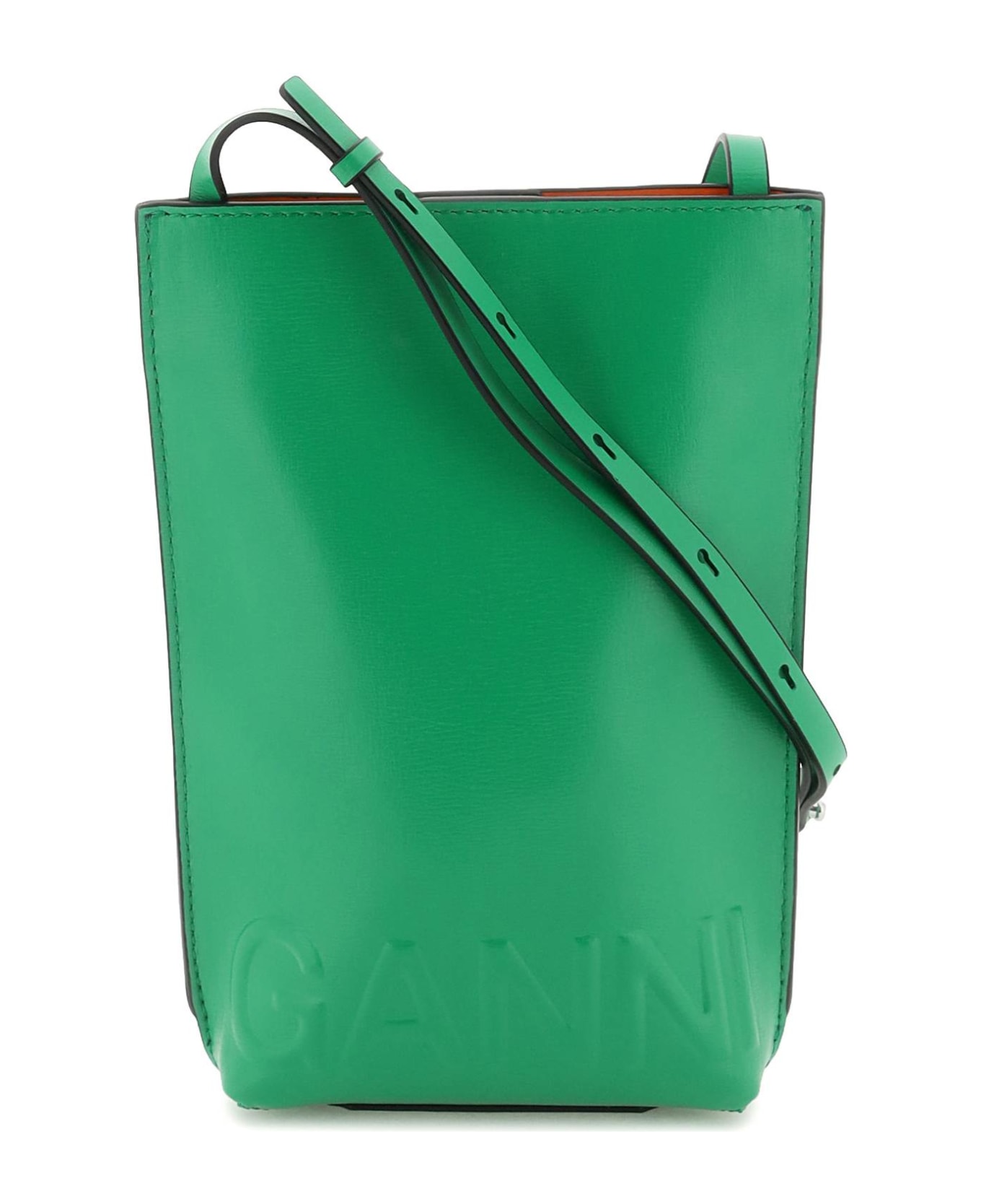 Crossbody bag by GANNI made of recycled leather blend, characterized by embossed logo at front. It features magnetic closure, fabric-lined interior, adjustable shoulder strap. Silver-finished metalware.