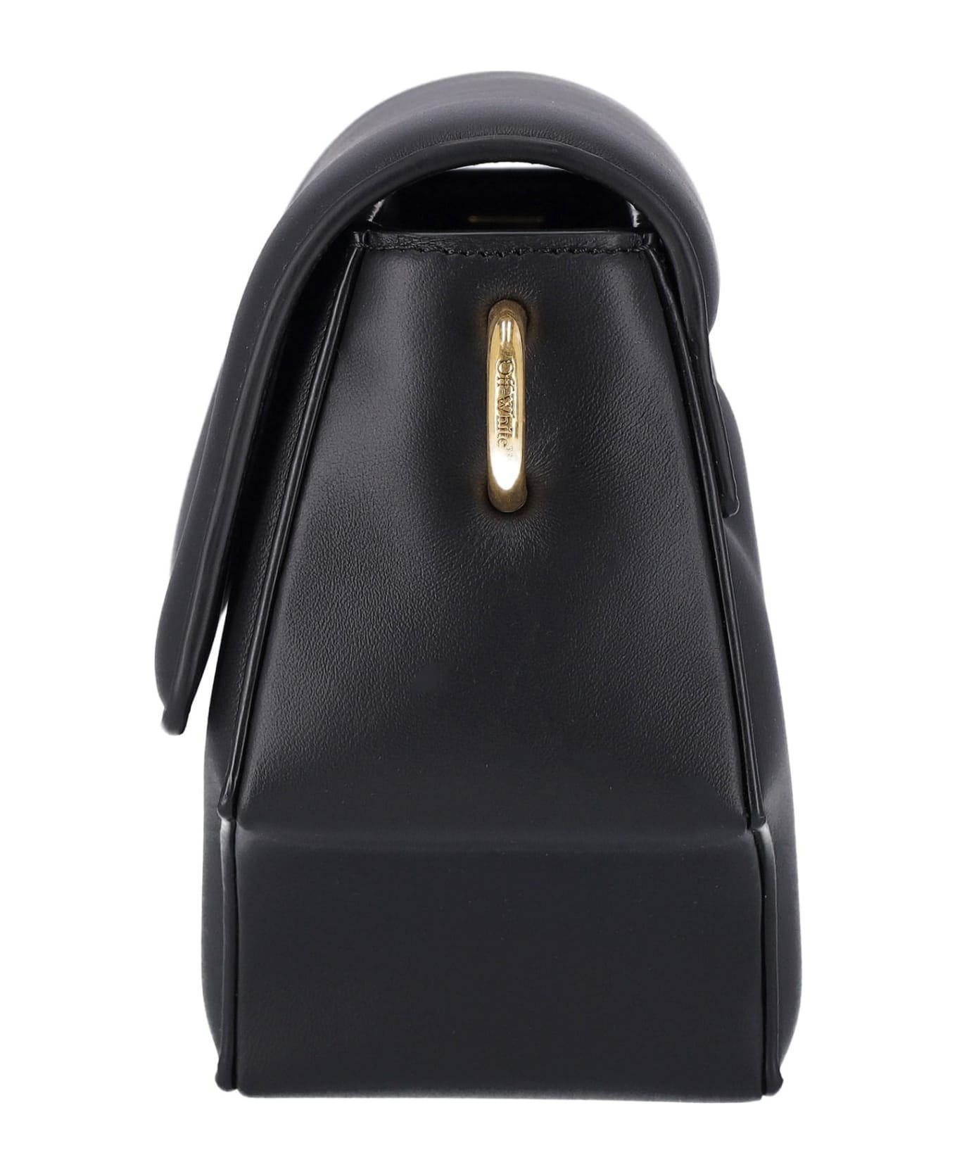 Off-White 'Barrow 24' Shoulder Bag, black leather, magnetic closure, fold-over flap with 'meteor' cut-out, one chain shoulder strap, one adjustable and removable leather shoulder strap, gold logo lettering on back, one internal card slot, one main internal compartment.
