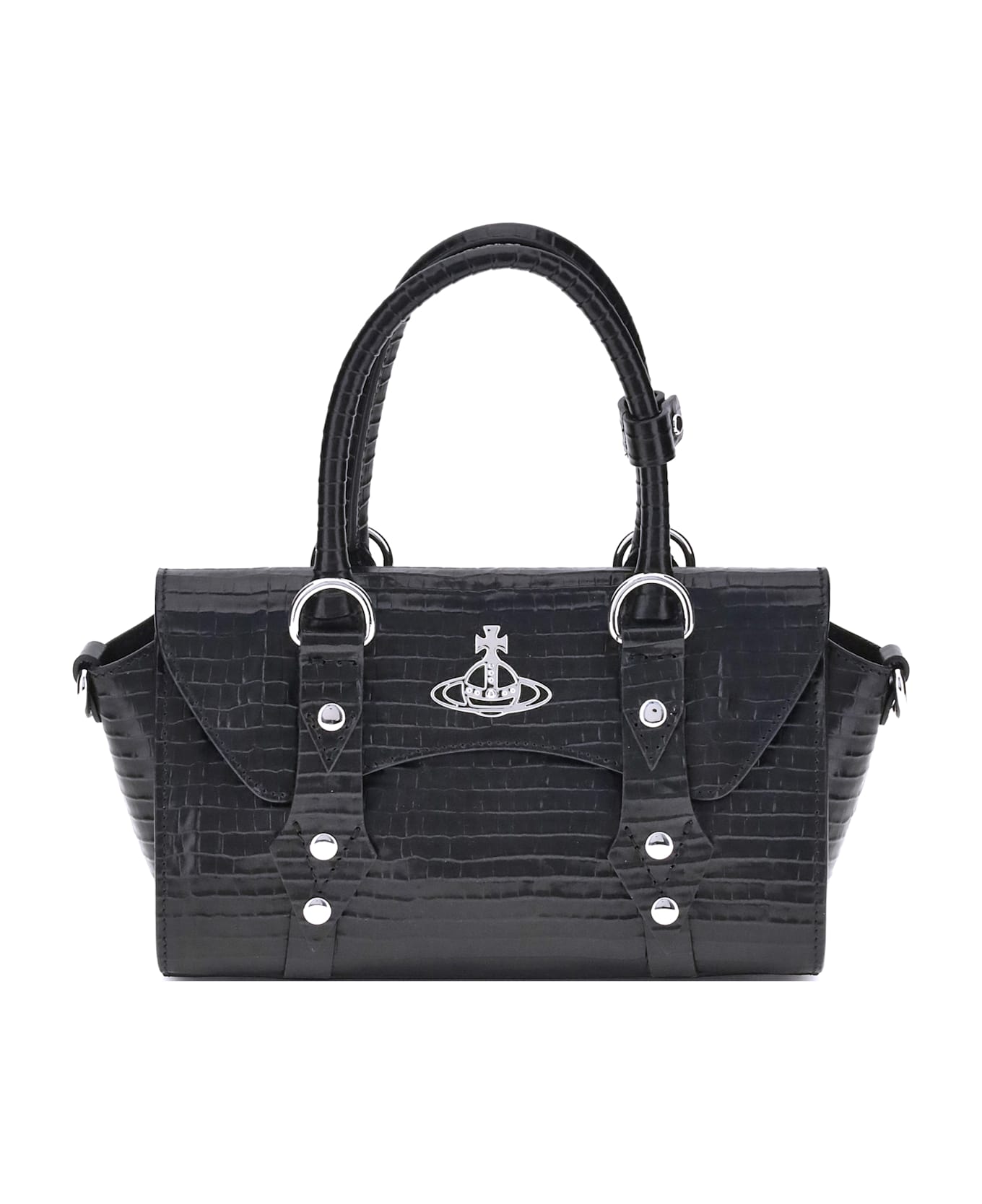 Vivienne westwood's bettina shoulder bag is an accessory with a strong character, made unique by the croco effect that enhances its sophisticated texture. equipped with two tubular handles and an adjustable and removable shoulder strap, it combines style and versatility. the iconic orb logo, the maison's unmistakable signature, stands out on the front. perfect for adding a gritty touch to any look.