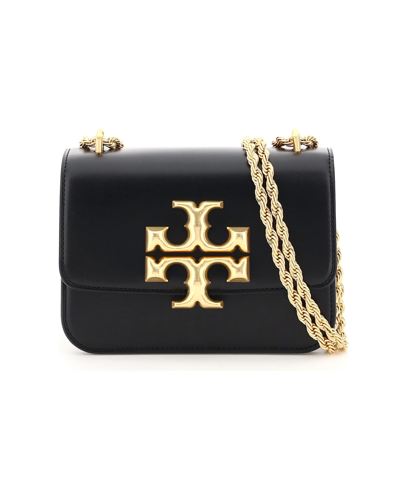 Tory Burch Eleanor small leather shoulder bag with a structured construction with flap, magnetic closure and the iconic embossed double T monogram. Sliding double-handle enhanced by a twisted chain with engraved monogram. Interior lined in contrasting leather with main gusset compartment, two flat compartments, one zip pocket. Gold-tone brass hardware.