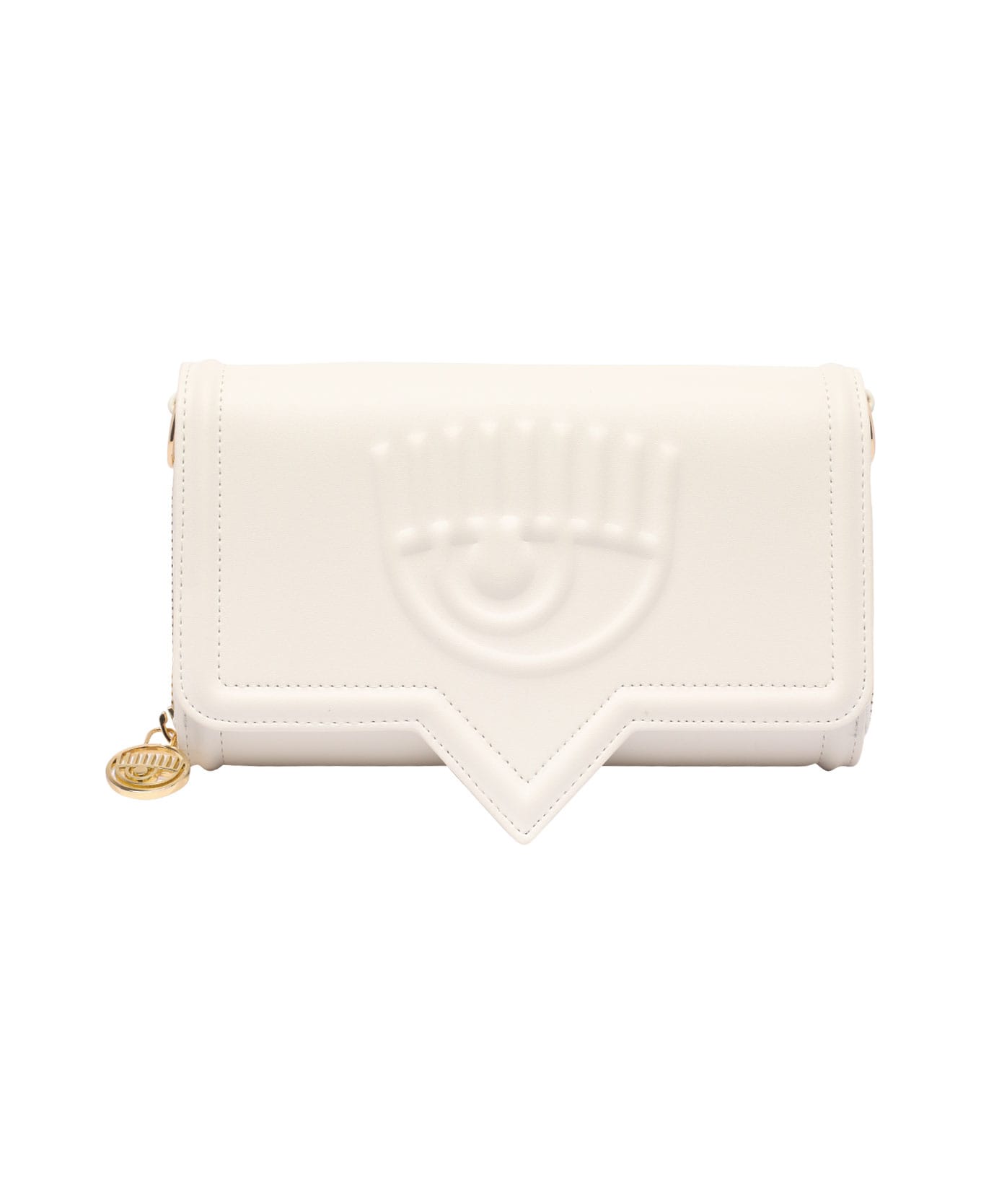 Chiara Ferragni white Eyelike crossbody bag, magnetic and zip closure, 4 compartments for banknotes, zip pocket, 2 flat pockets, 8 slots, adjustable and removable chain shoulder strap