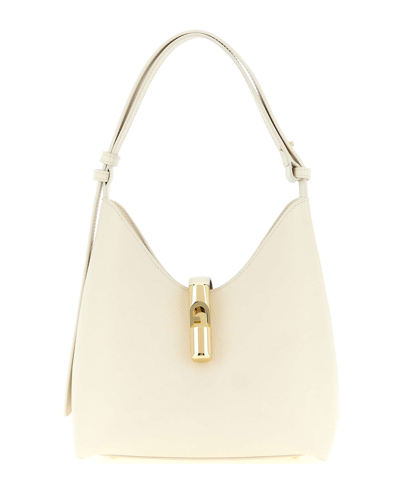 Small 'Furla Goccia' shoulder bag in smooth leather and printed midnight calfskin leather, hobo model, soft and unstructured silhouette, cylindrical hardware closure with weight and carved 'Arco Furla' logo, back embossed lettering logo, adjustable handle, rigid base with metal feet, lining, two inner pockets.