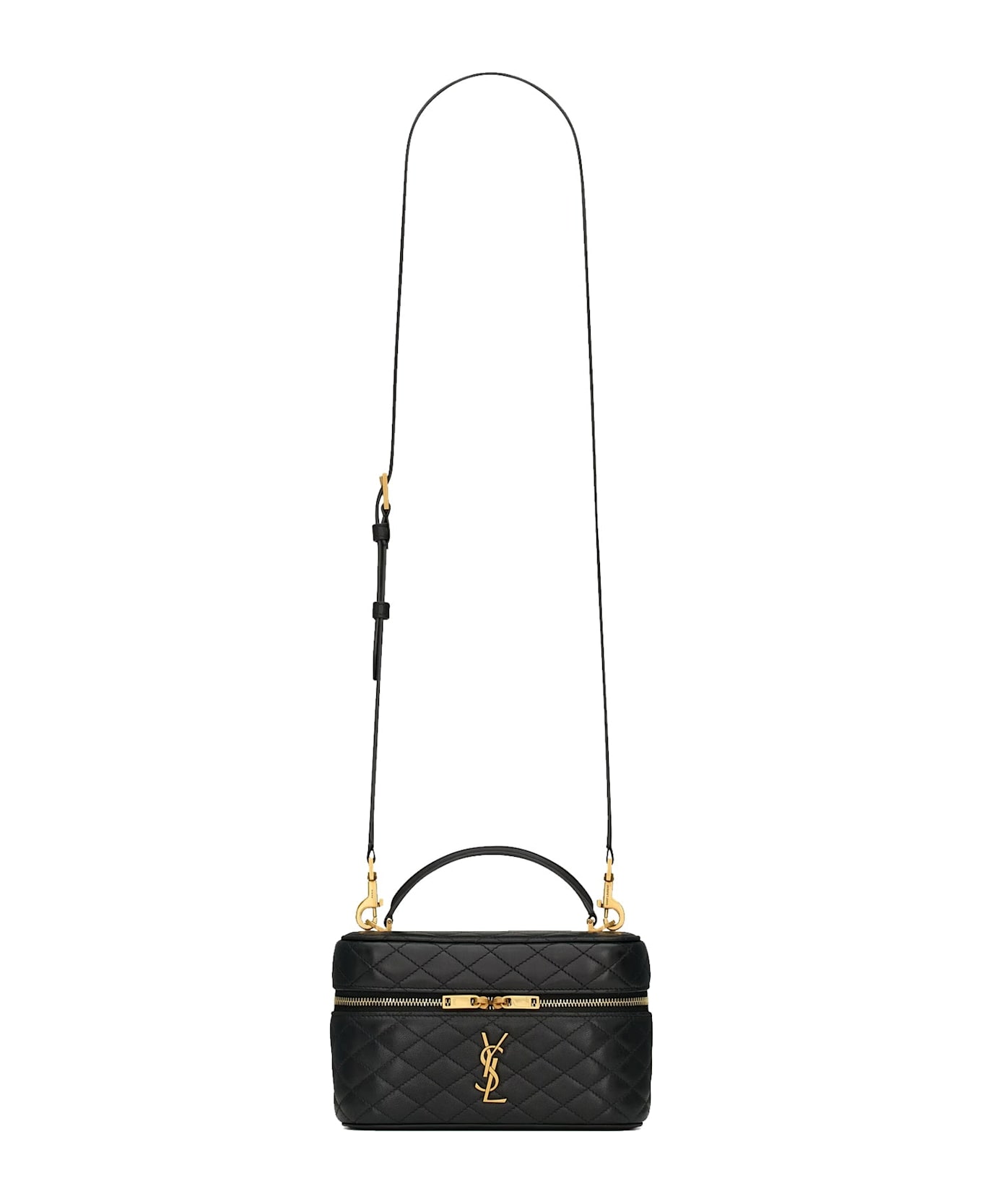Composition: 100% Lamb Leather Lenght 18 cm One top handle Detachable shoulder strap Iconic YSL logo Width 6,5 cm Quilted effect Round zip closure Height 11 cm Made in Italy