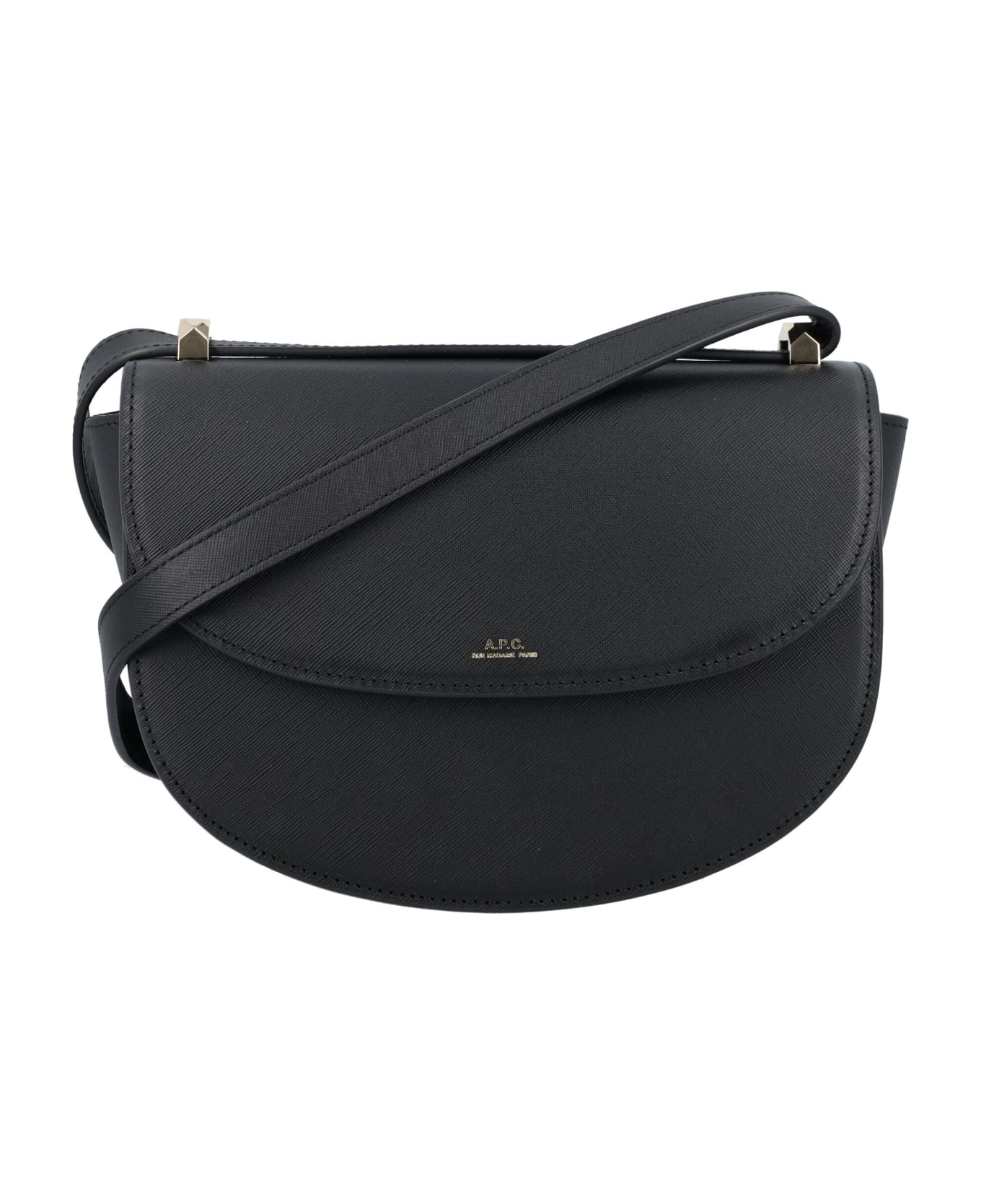Genève Saffiano Bag By A. p. c. Featuring: Foldover Top With Magnetic Closure Gold-tone 'a. p. c. Rue Madame Paris' Logo Embossed On The Front Adjustable Sliding Buckle Shoulder Strap Faceted Brass U-rings On Top Rounded Bottom Interior Patch Pocket Gold-tone Hardware Height: 18cm Width: 25cm Depth: 8,5cm