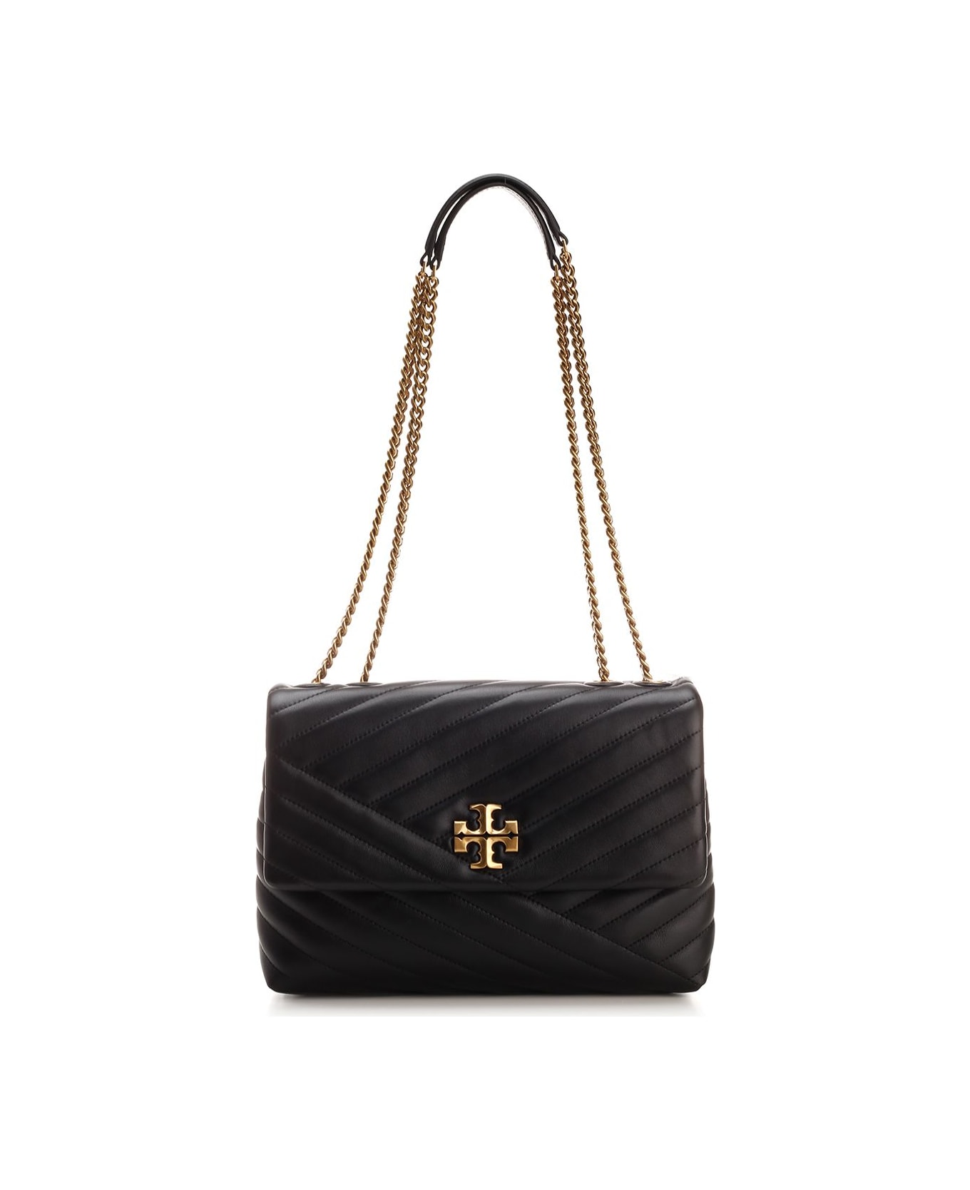 "Kira" shoulder bag in ivory quilted leather from Tory Burch, with sliding shoulder strap, lined interior with 2 open compartments and a central zip compartment.