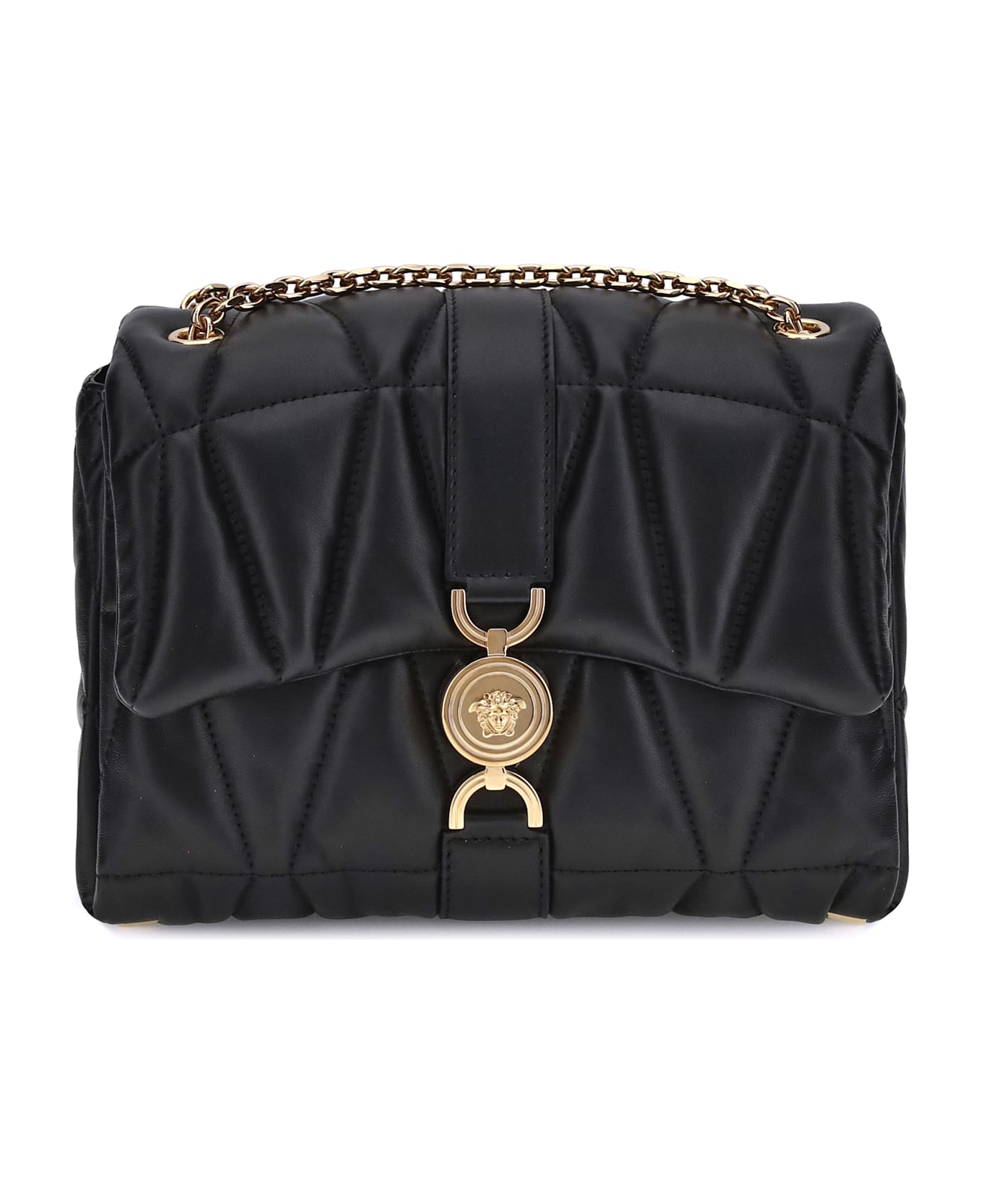 The kleio shoulder bag by versace is crafted from soft quilted lambskin, embellished with the medusa '95 metal detail on the front, an iconic symbol of the maison. the metal chain shoulder strap is versatile and can be worn single or double, adding a touch of elegance. the closure is via a magnetic button, while the lined interior is organized with a patch pocket and three compartments for perfect functionality.