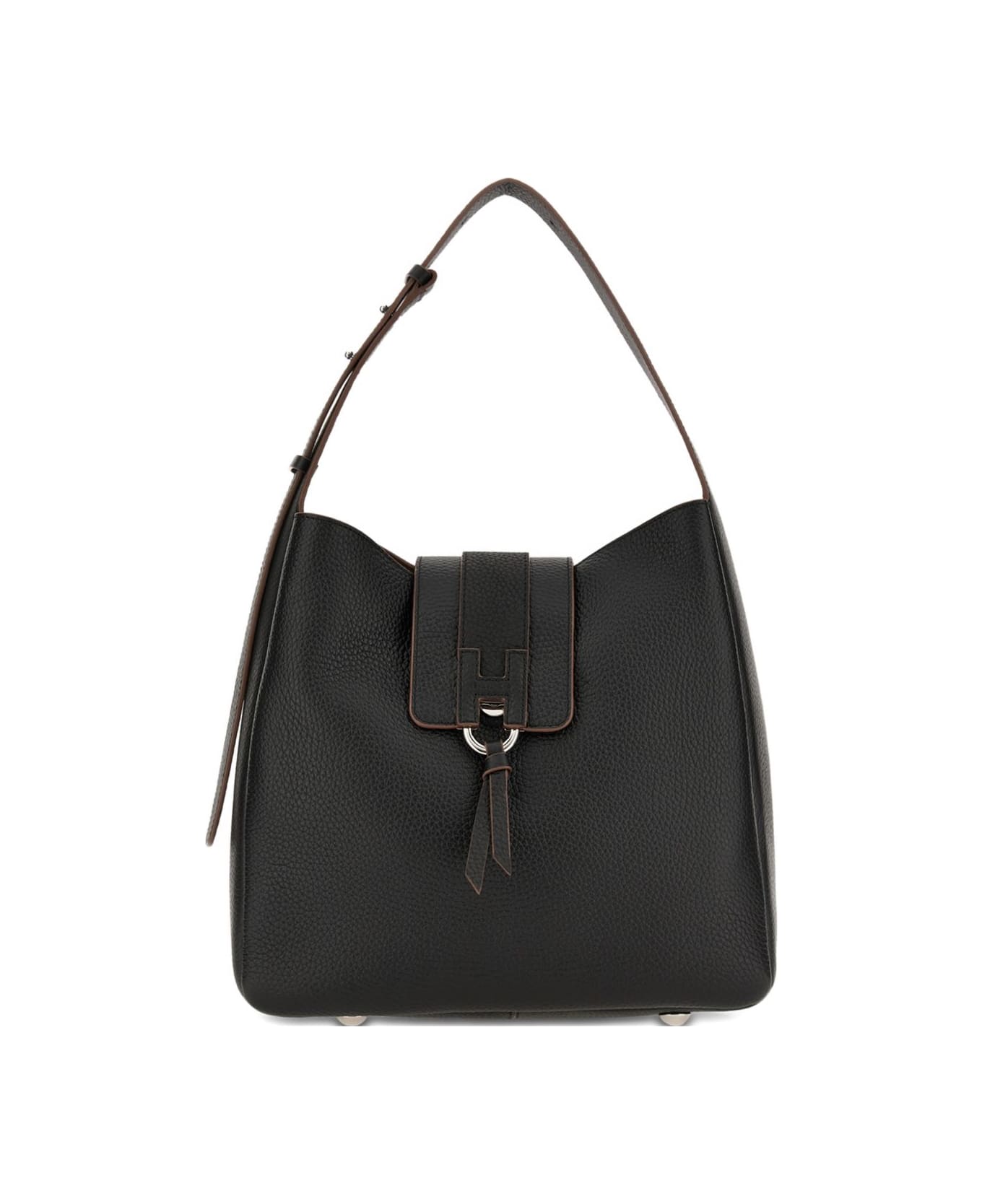 black grained texture adjustable shoulder strap silver-tone hardware metal ring detail