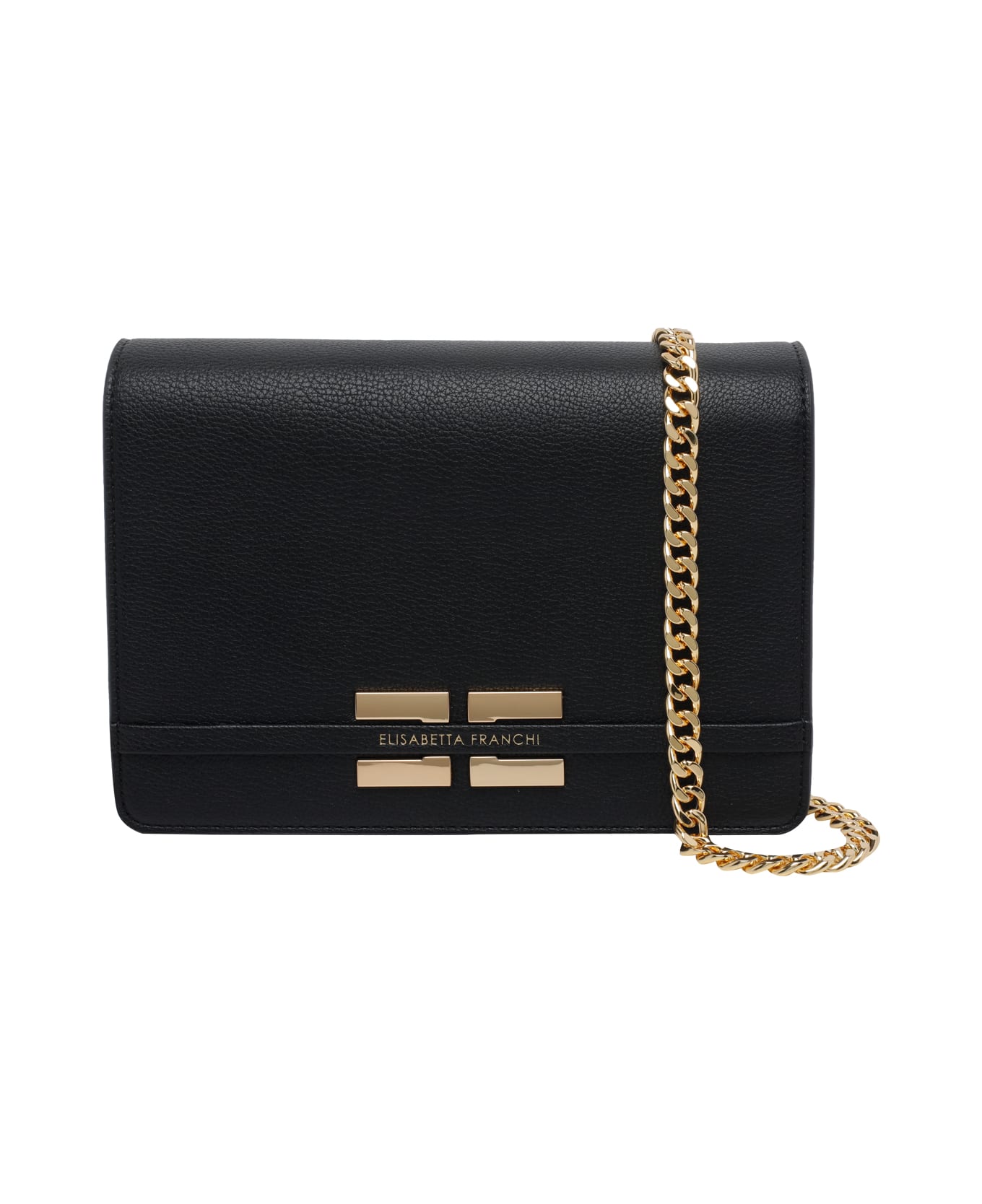 Elisabetta Franchi black crossbody bag, magentic closure, inner pocket with zip closure and one open pocket, chain shoulder strap, logo on the front Composition: 59% Polyester, 22% Wood Dust, 19% Polyurethane