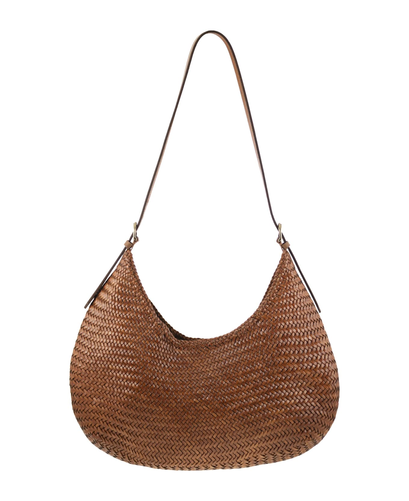 The Full Moon mirrors the unique rounded and soft design of its smaller counterpart, the Half Moon , made with Buff calfskin straps. This large tote balances space and portability and features a flat, adjustable shoulder strap for comfortable shoulder use. Its distinctive round shape makes it a stylish choice for those seeking a practical yet eye-catching accessory. A pendant in the shape of an antiqued St Christopher medal, in homage to the patron saint of travellers, is hand-sewn inside each Dragon Diffusion bag - the brand's seal of authenticity. - Hand-woven basket - buffalo calfskin - Unlined DESIGNER ID: 8022 TAN BLACK EDGE