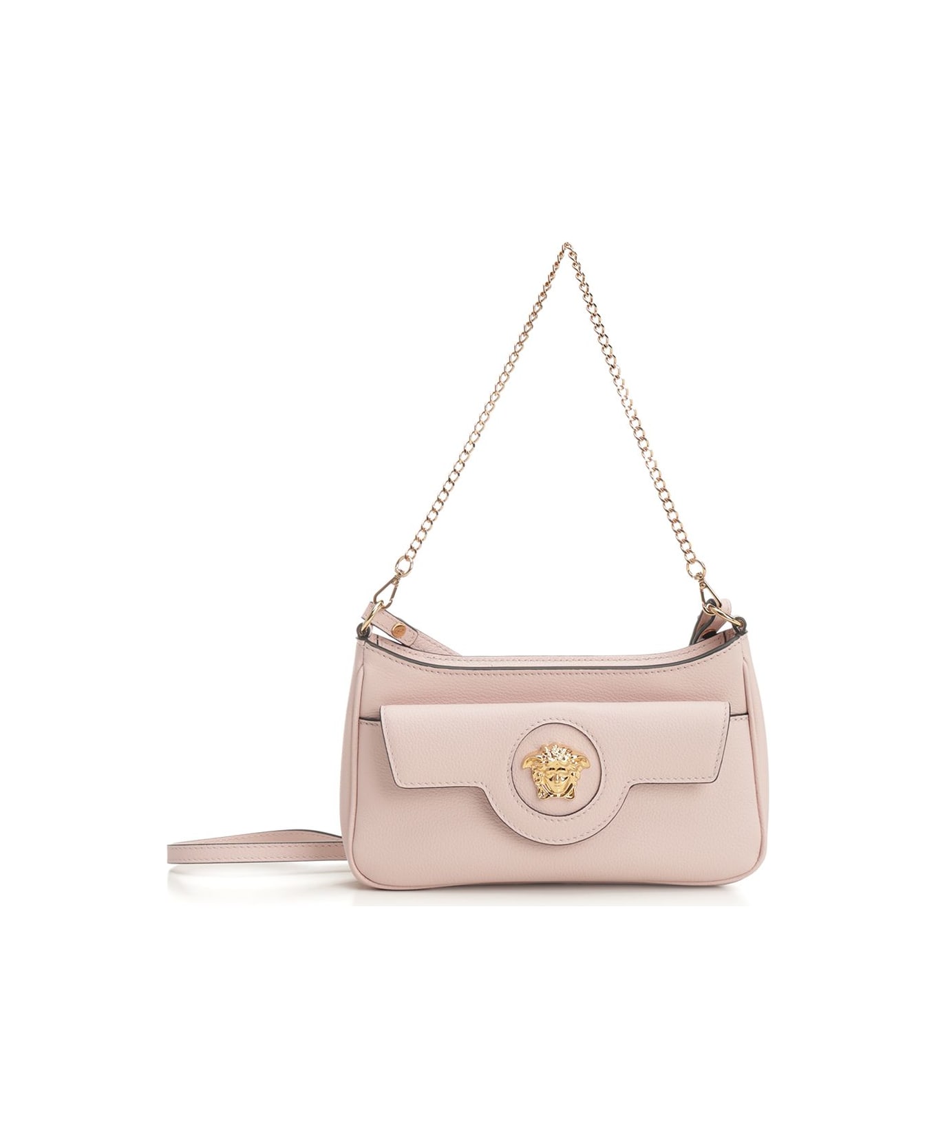 "La Medusa" mini bag by Versace, in grained calfskin with the house's signature three-dimensional hardware. It features a top zip closure, a front flap pocket with magnetic closure, and an interior pocket. It can be worn by hand or over the shoulder thanks to the removable chain strap.