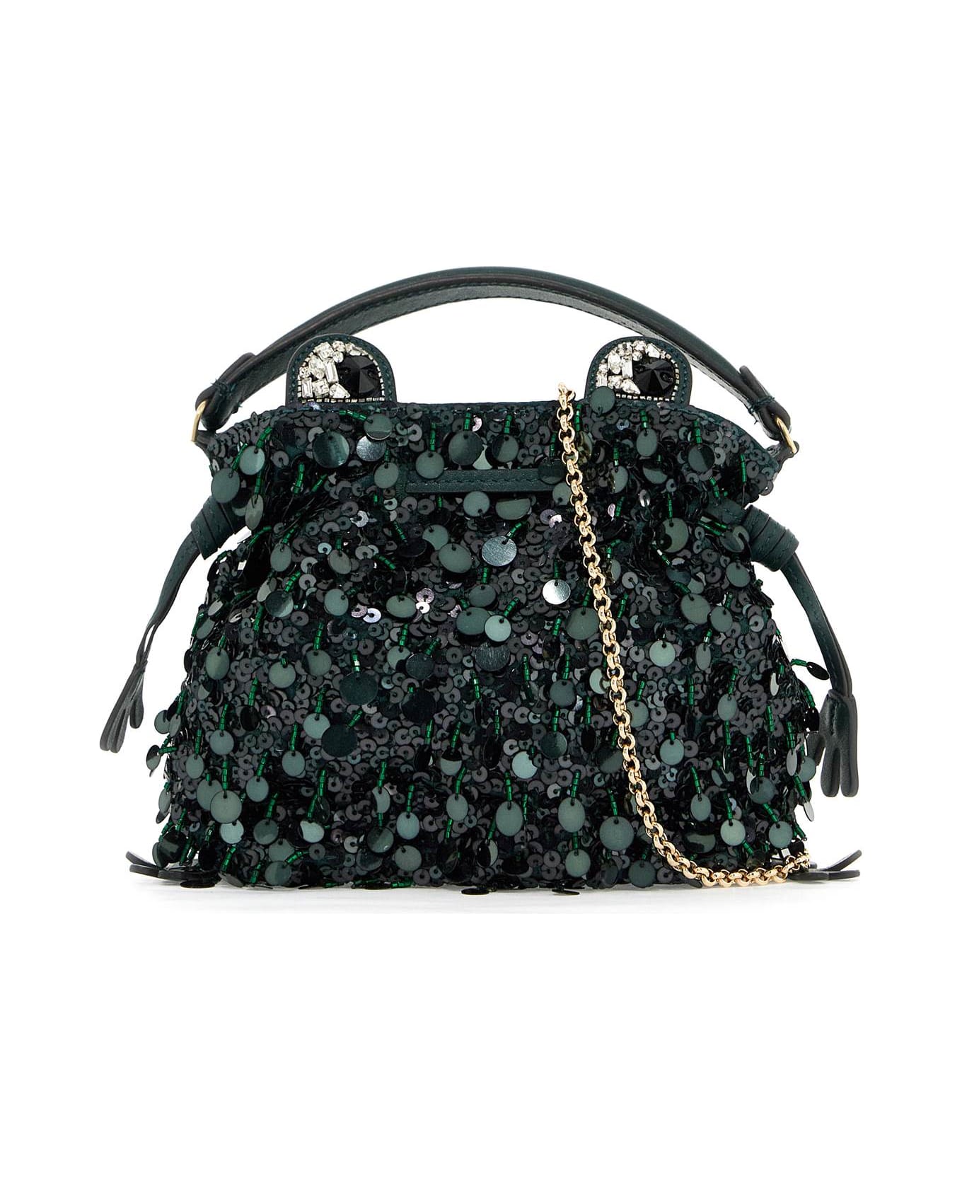 The Frog mini crossbody bag by Anya Hindmarch is made of recycled satin and adorned with sequins, finished with leather details and crystal-studded eyes. It features top paw prints that act as a drawstring closure, a satin lining, a single handle, and an additional chain shoulder strap in gold metal.