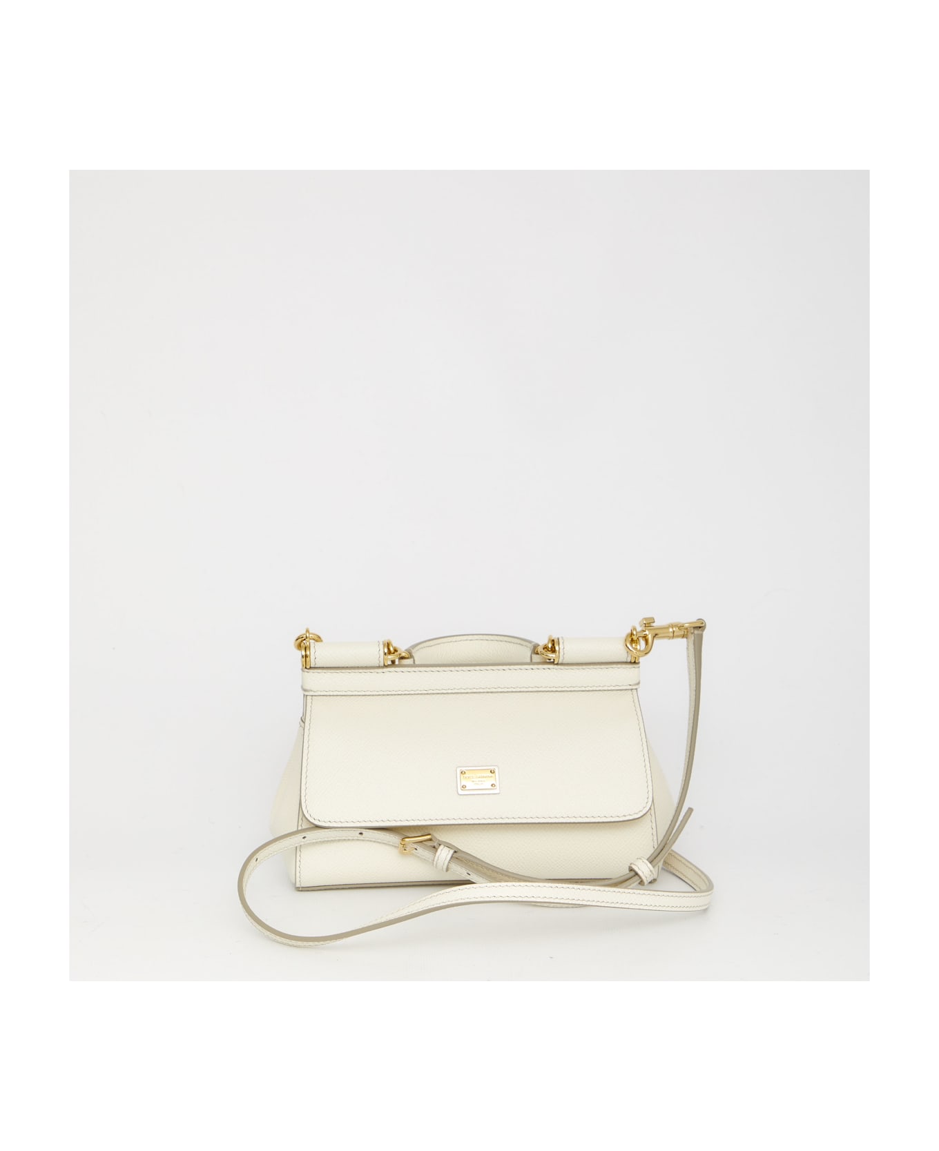 Mini Sicily bag in white grained Dauphine calfskin with Dolce & Gabbana logo metal plate on the front. It features fixed top handle, adjustable and detachable shoulder strap, flap with magnetic closure, one main interior compartment and one interior flat pocket. Inner lining in leopard print cotton.