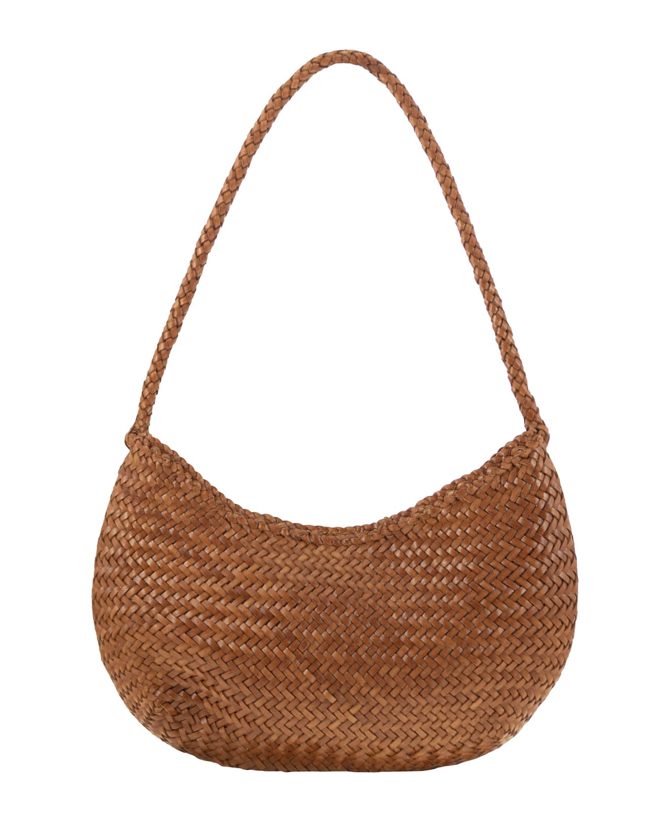 The "Nova Luna" is a compact version of the Luna Mezza, maintaining the unique round and supple design but in a smaller scale, crafted from soft Buffalo Calf leather. This tote features a woven handle that is designed to comfortably fit over your shoulder, making it easy to carry all day. The distinctive shape and size of the Nova Luna make it an ideal choice for those who need a smaller, yet still stylish bag for essential items. An antiqued St. Christopher medal charm, in homage to the patron saint of travellers, is hand-sewn inside each and every Dragon Diffusion bag brand s very own seal of authenticity. - Handwoven Basket - Buffalo Calf Leather - No lining - Magnetic button closure DESIGNER ID: 8020TAN