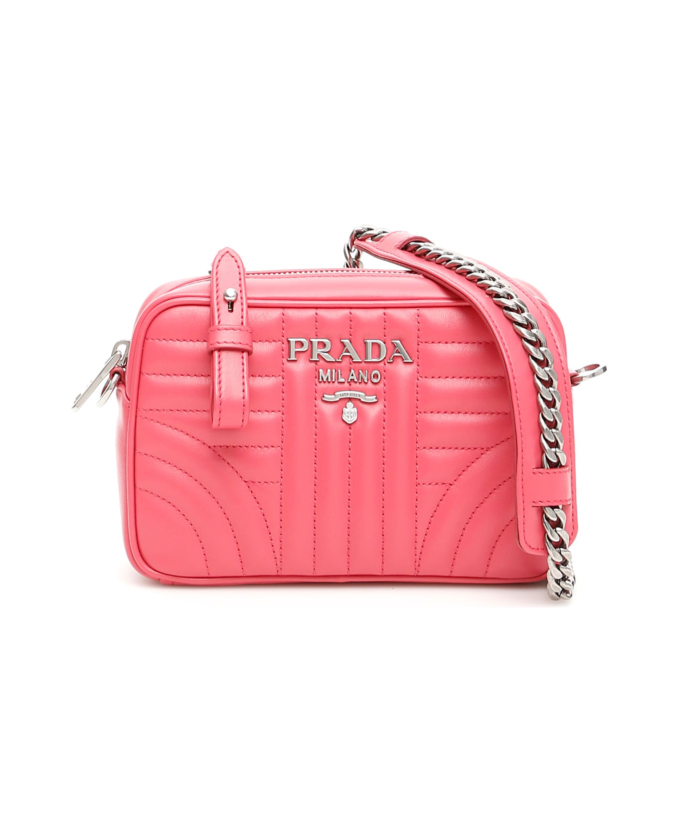 Prada quilted leather mini bag with front lettering. Removable chain and leather strap, zip closure, logo twill lining with inside leather pocket. Steel-finish metal hardware. Composition: 100% vitello