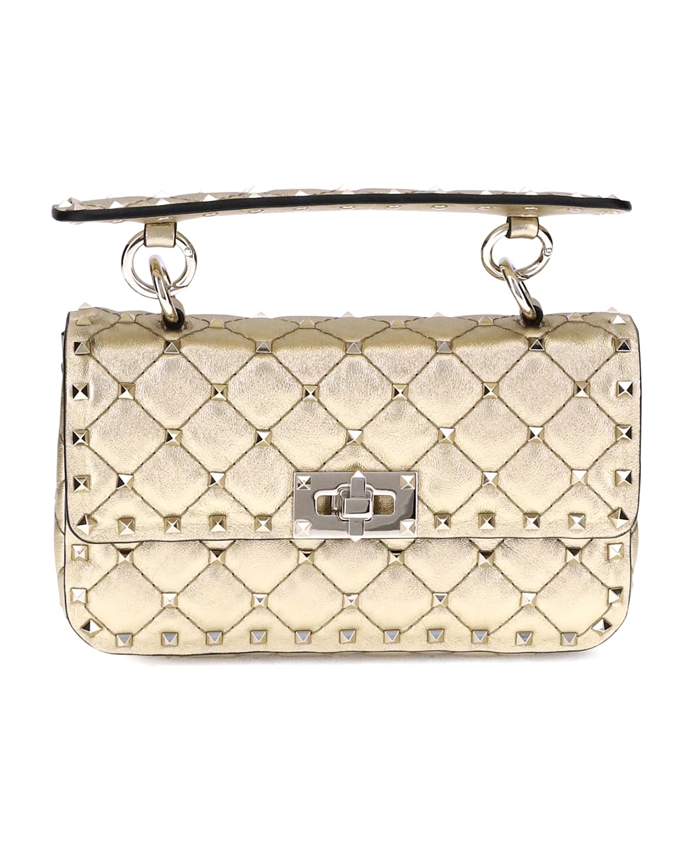 Valentino garavani's rockstud spike small shoulder bag is a perfect blend of sophistication and boldness. quilted workmanship with a metallic finish and small studs decorating the entire accessory give it a distinctive and sophisticated character. with its removable handle and sliding, removable chain strap, it can be worn on the shoulder, cross-body or hand-held, adapting to every need. the swivel closure adds a touch of elegance, making this bag a true style statement.