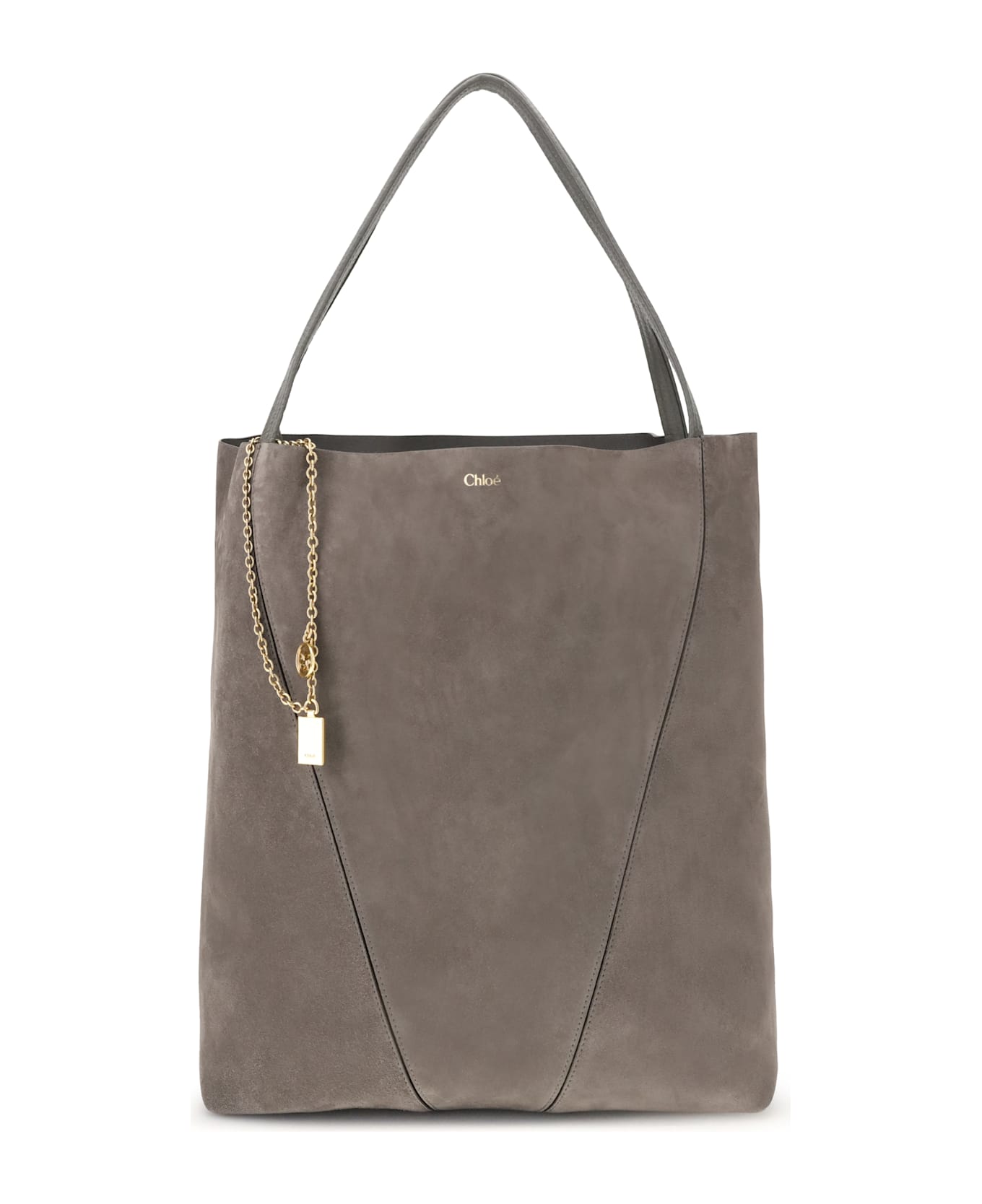 The spin tote bag by chloé embodies refined, timeless style. crafted from soft suede calfskin with smooth leather trims, it features a clean, rectangular silhouette defined by minimalist lines. dual top handles allow it to be carried by hand or worn over the shoulder, making it a versatile companion for any occasion. signature details include a delicate chain adorned with chloé and horse charms, adding a subtle jewelry-inspired accent. completed with a spacious main compartment and dust bag, it balances practicality with the sophisticated femininity of the maison.