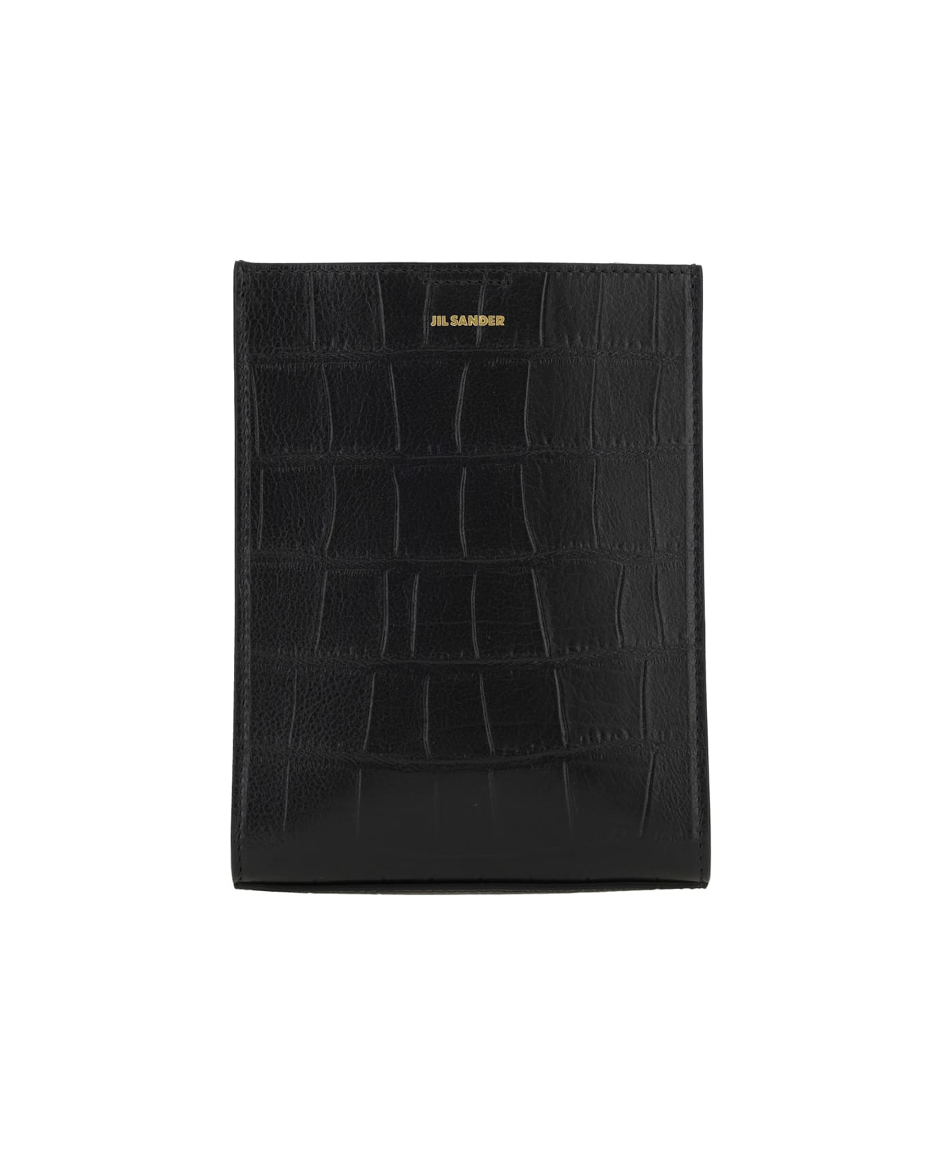 Calfskin tangle shoulder bag by jil sander, shoulder strap with braid detail, gold-plated rings at the base of the shoulder strap, crocodile-effect leather design, iconic brand monogram printed on the front, concealed snap fastening inside.