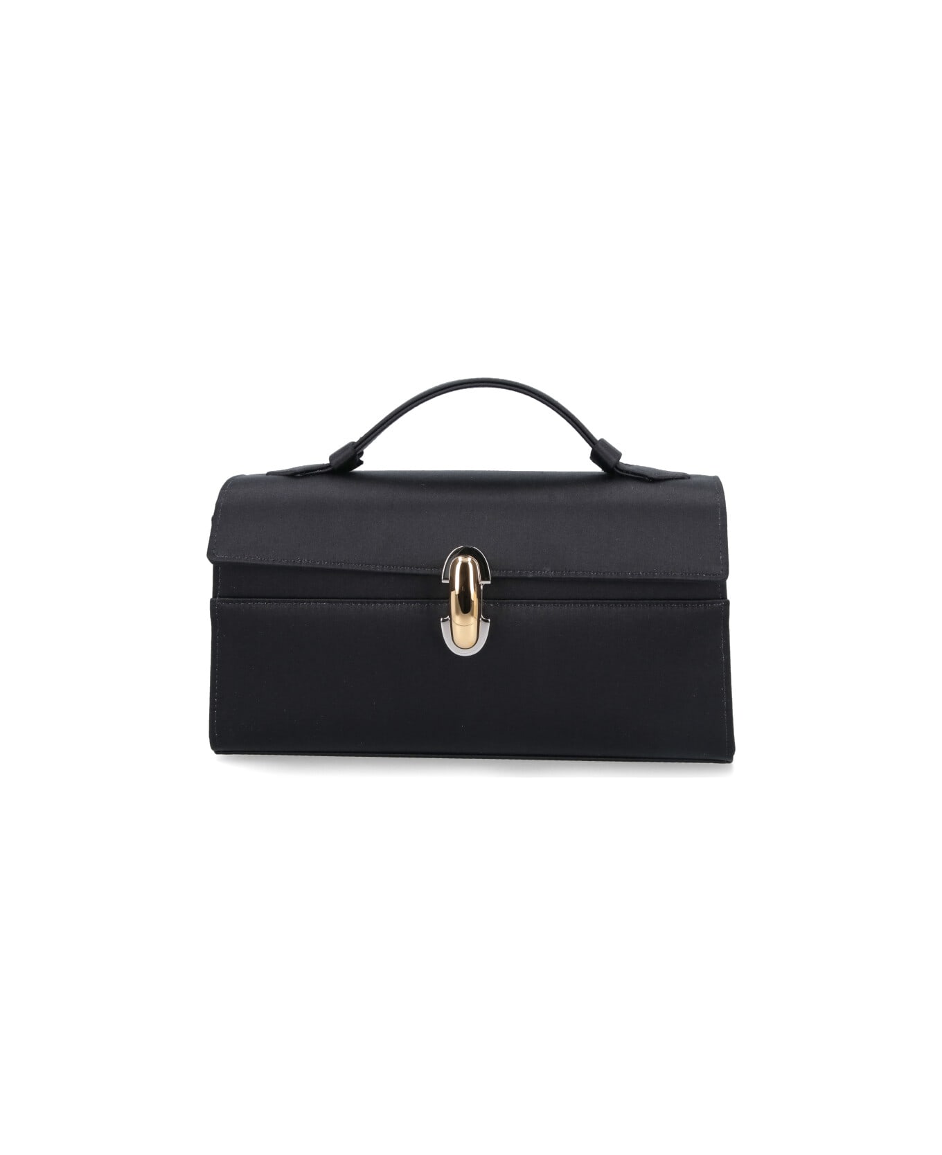 Savette 'Symmetry' pouch in black viscose and silk blend satin, top handle, silver metal closure on the front, embossed logo inside, inner slip pocket, single main inner compartment.