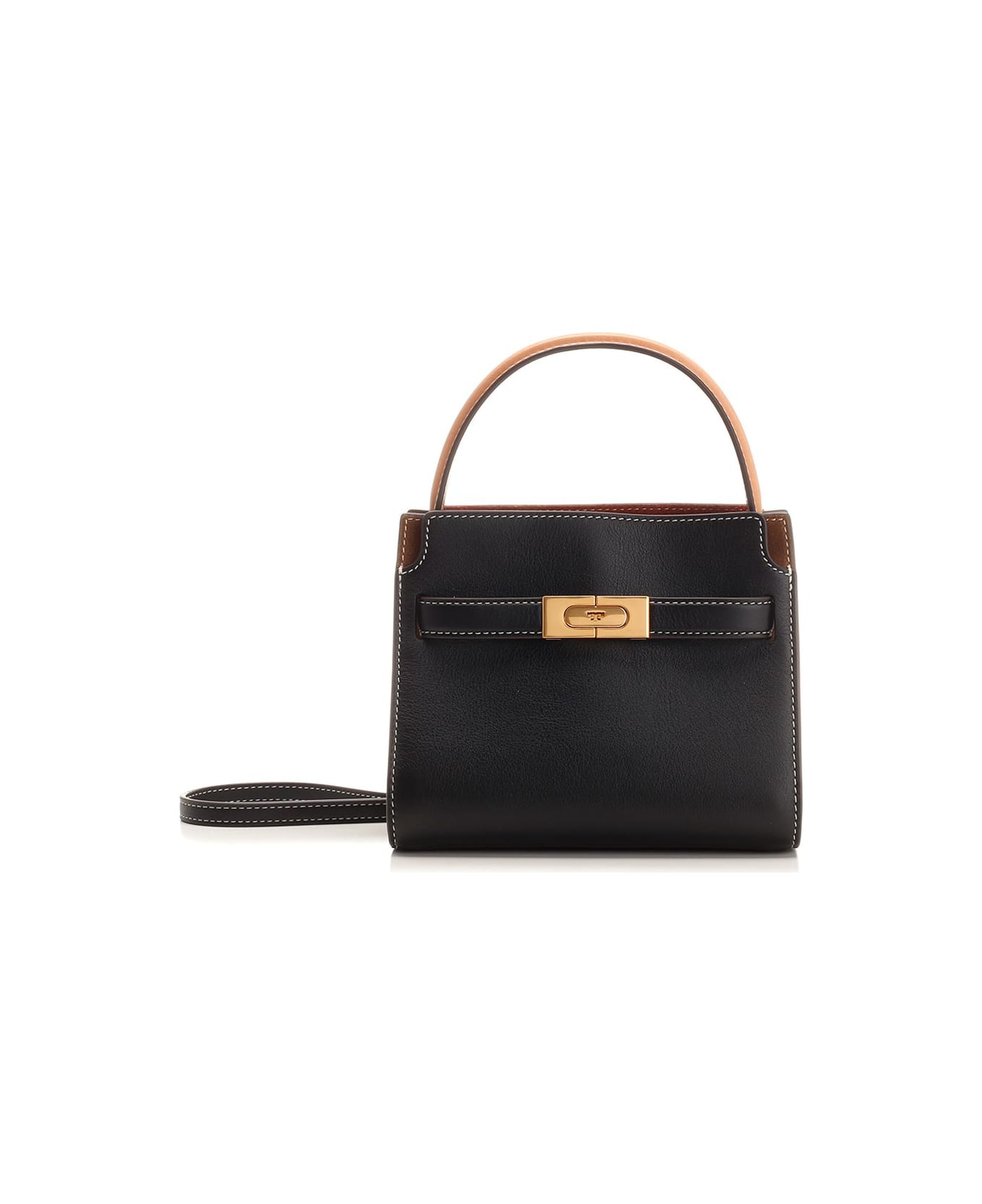 "Lee Radziwill" double bag from Tory Burch, in grained leather and brown suede, with automatic closure, leather shoulder strap with buckle closure, adjustable and removable shoulder strap, five internal compartments, one side zip pocket, one side welt pocket.