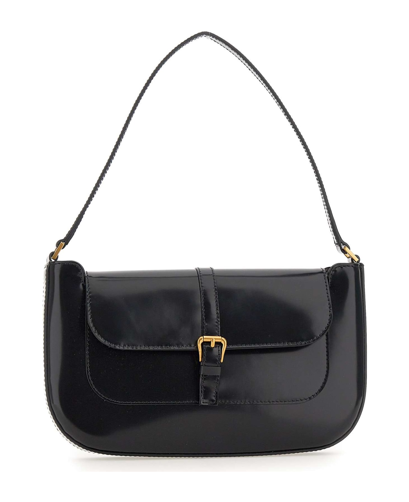 By Far "Miranda" in semi-patent leather shoulder bag, black, baguette design, brushed gold metal finishes in zamak, leather handle, magnetic button and buckle closure, inside pocket, cotton lining. Dimensions: height 15cm, length 26cm, depth 2cm. Case included.