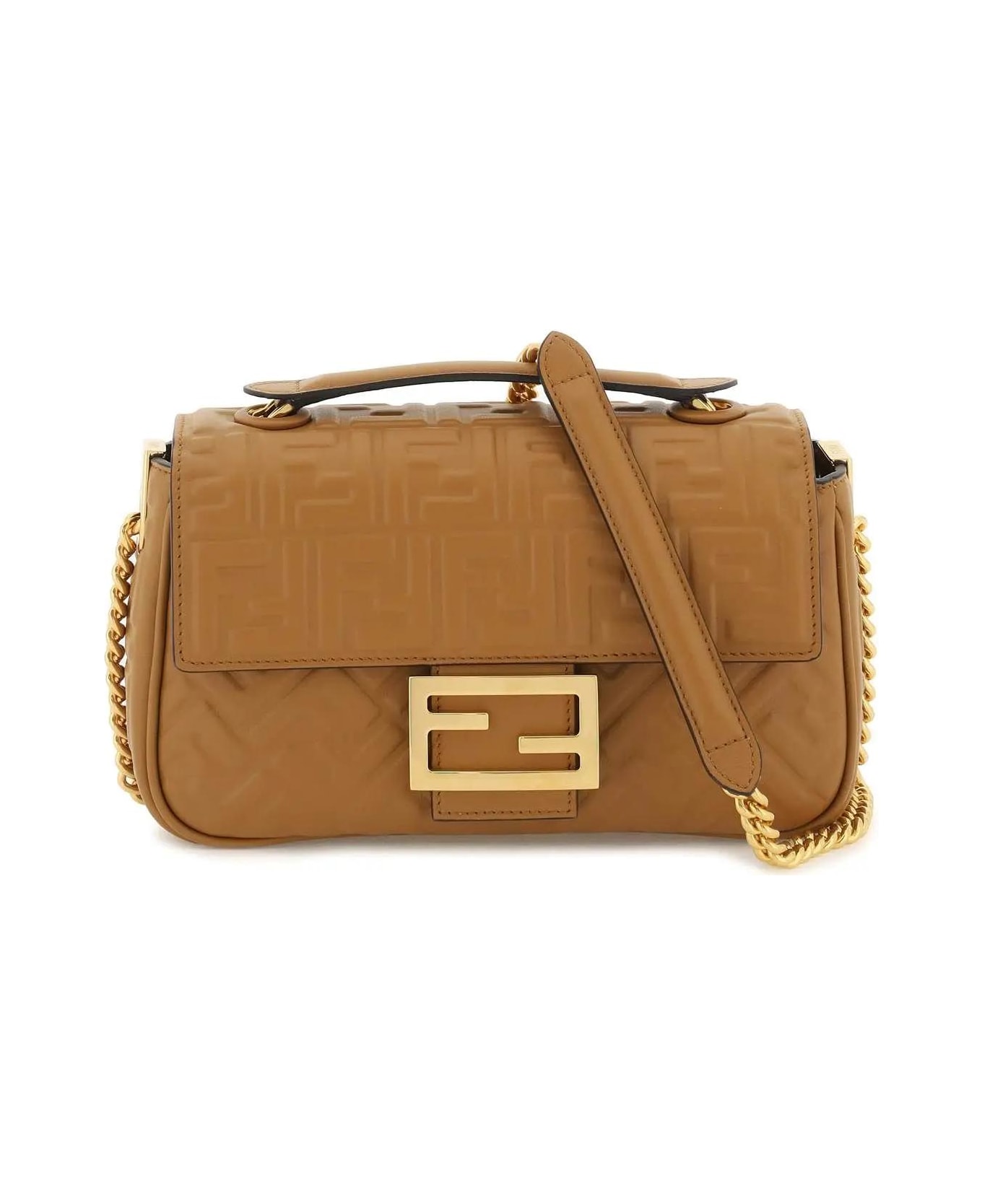 Baguette Chain Midi bag by Fendi crafted in soft nappa leather with all-over embossed FF motif. Flap with magnetic button closure enriched with the metal FF buckle. Carriable by hand, on the shoulder or crossbody with the sliding chain strap with leather inserts. Smooth nappa lining and one inner zipped flat pocket. Gold-finished metalware. Composition: 100% Lamb Leather