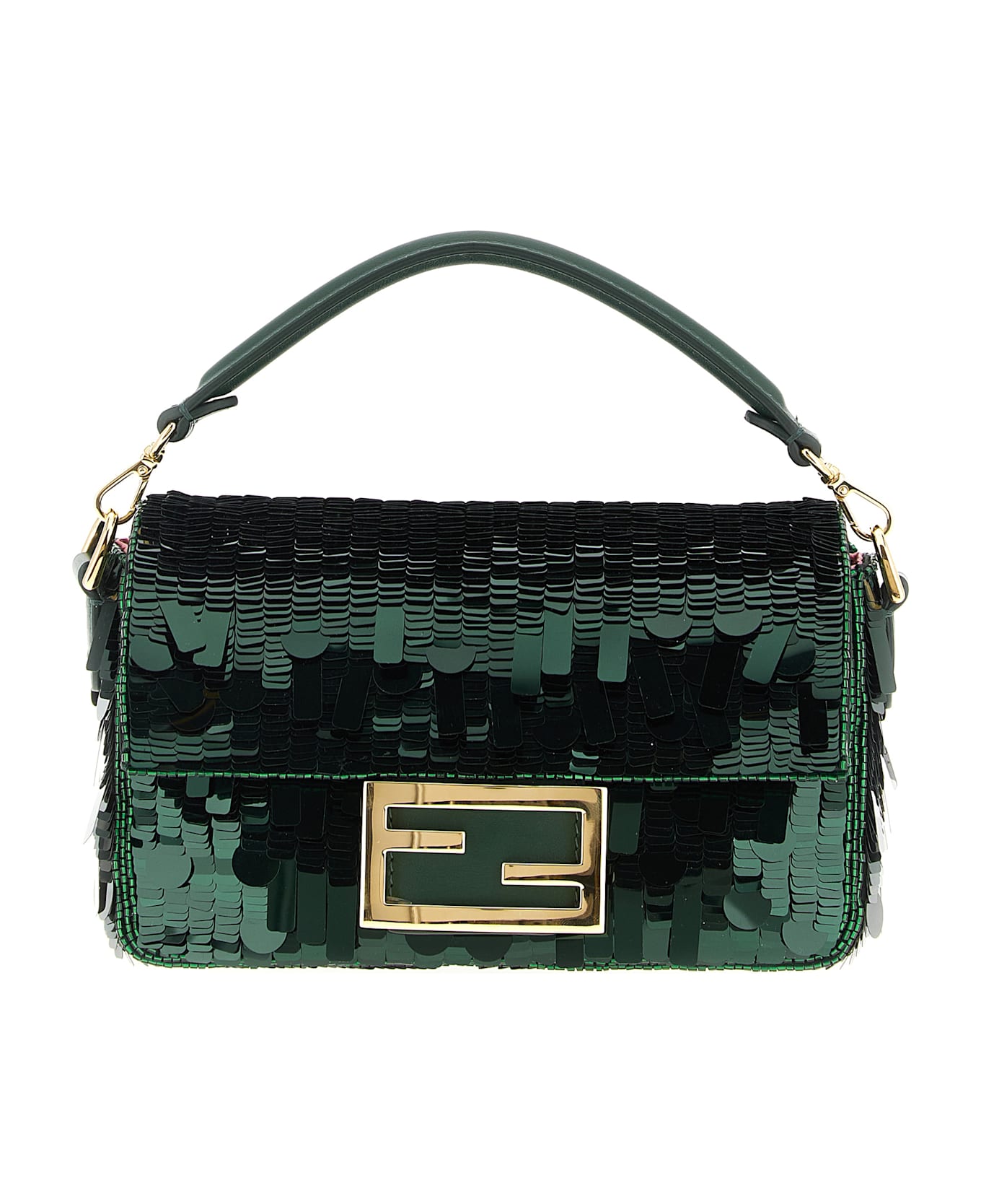 'Baguette' mini calf leather handbag with all-over sequin appliqué, magnetic flap closure with front metal FF logo, removable handle, removable chain shoulder strap, contrast satin lining. Composition: 82% polyester, 18% res
