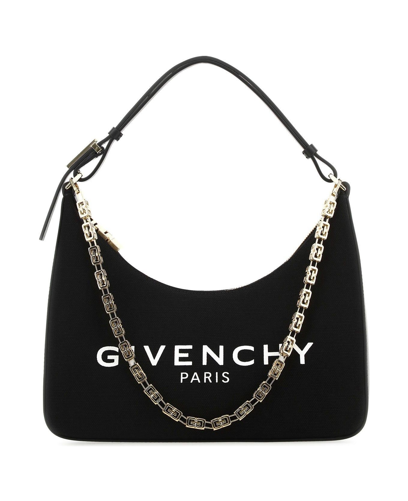 Shoulder bag realized in smooth calf leather characterized by contrasting printed logo at the front enriched by metal logoed chain at the front. - A tonal leather flat handle - Zip closure - Lined Composition: Exterior: 58% Flax 38% Cotton 4% Polyurethane 100% Calf Lining: 100% Leather Finishing: Golden metal