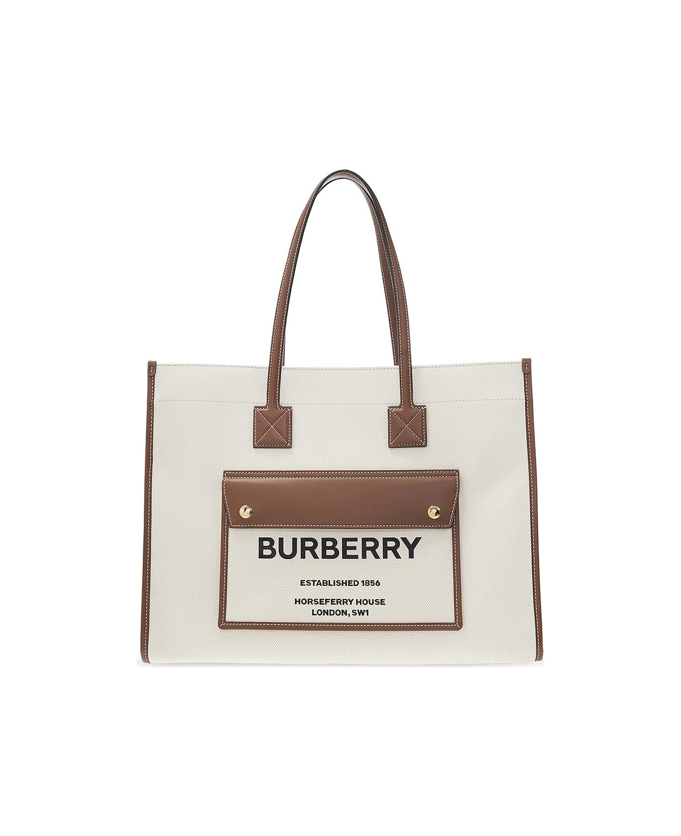 Brown and cream shopper bag from Burberry. Printed with the brand's logo in black, this design features a snap fastening, leather trims, a flapped pocket with a magnetic closure on the front, two half-round handles, gold-tone metal hardware and one intern