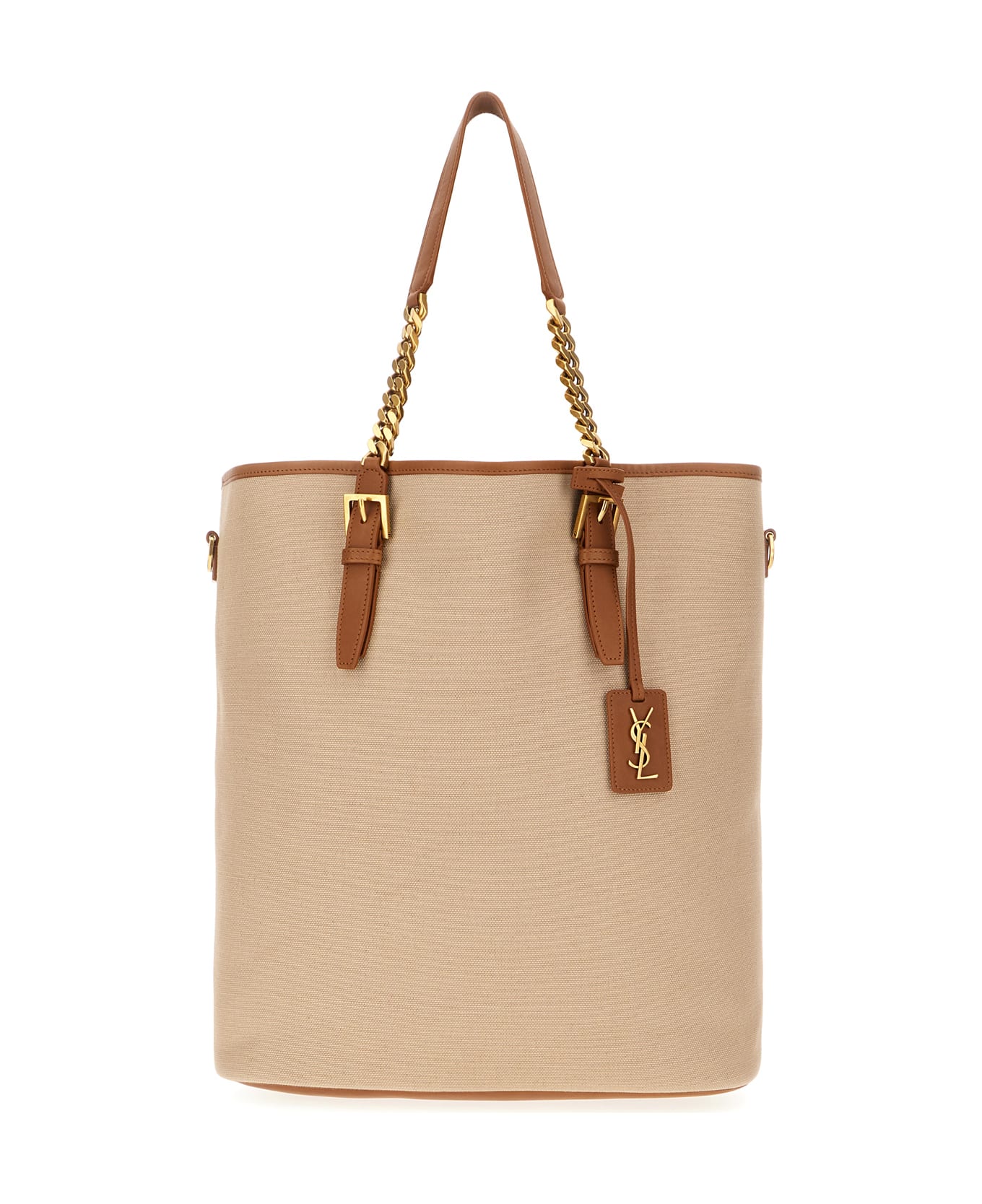 Shopping bag realized in canvas with contrasting leather inserts enriched by detachable logoed charm at the front. -Contrasting leather and metal chain handles -Adjustable detachable leather shoulder strap -Lined interior with a zip pocket Composition: Exterior: 100% Canvas Lining: 100% Canvas 100% Leather Finishing: Golden metal