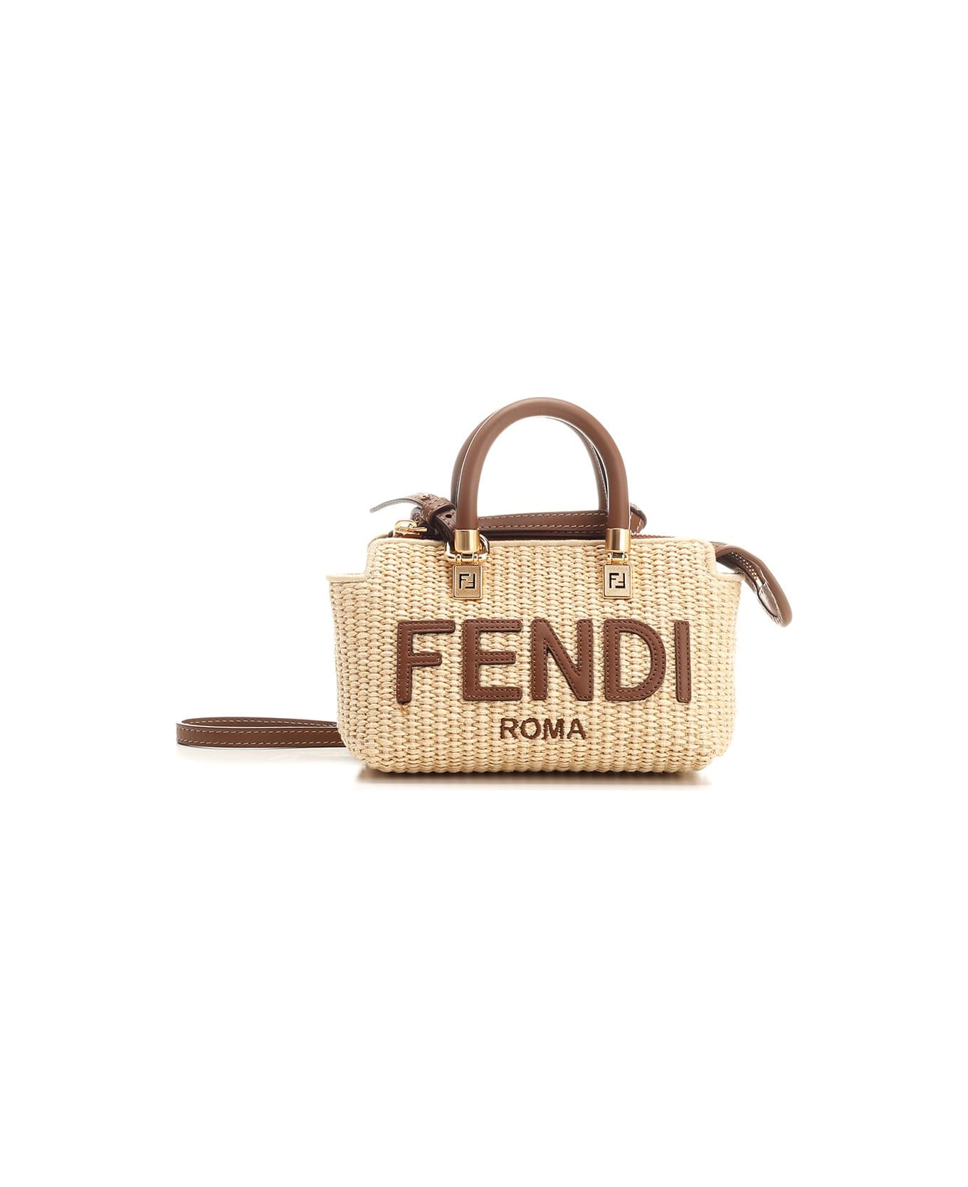 "Fendigraphy" woven straw bowling bag from Fendi, with brown leather finishes, top zip closure, removable shoulder strap. Composition: paglia, leather