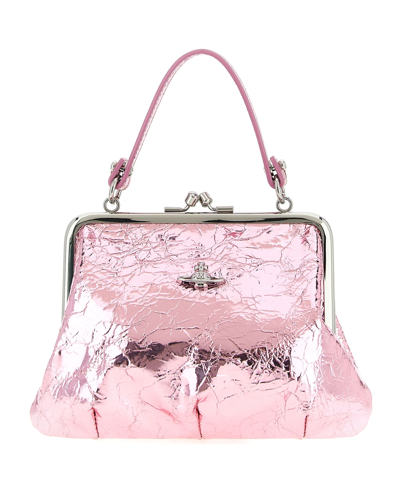 'Granny Frame Purse' leather handbag with a ruffled metallic finish, front metal Orb logo, snap closure, removable short handle, and a removable chain shoulder strap. Composition: 100% calfskin leather (Bos Taurus)