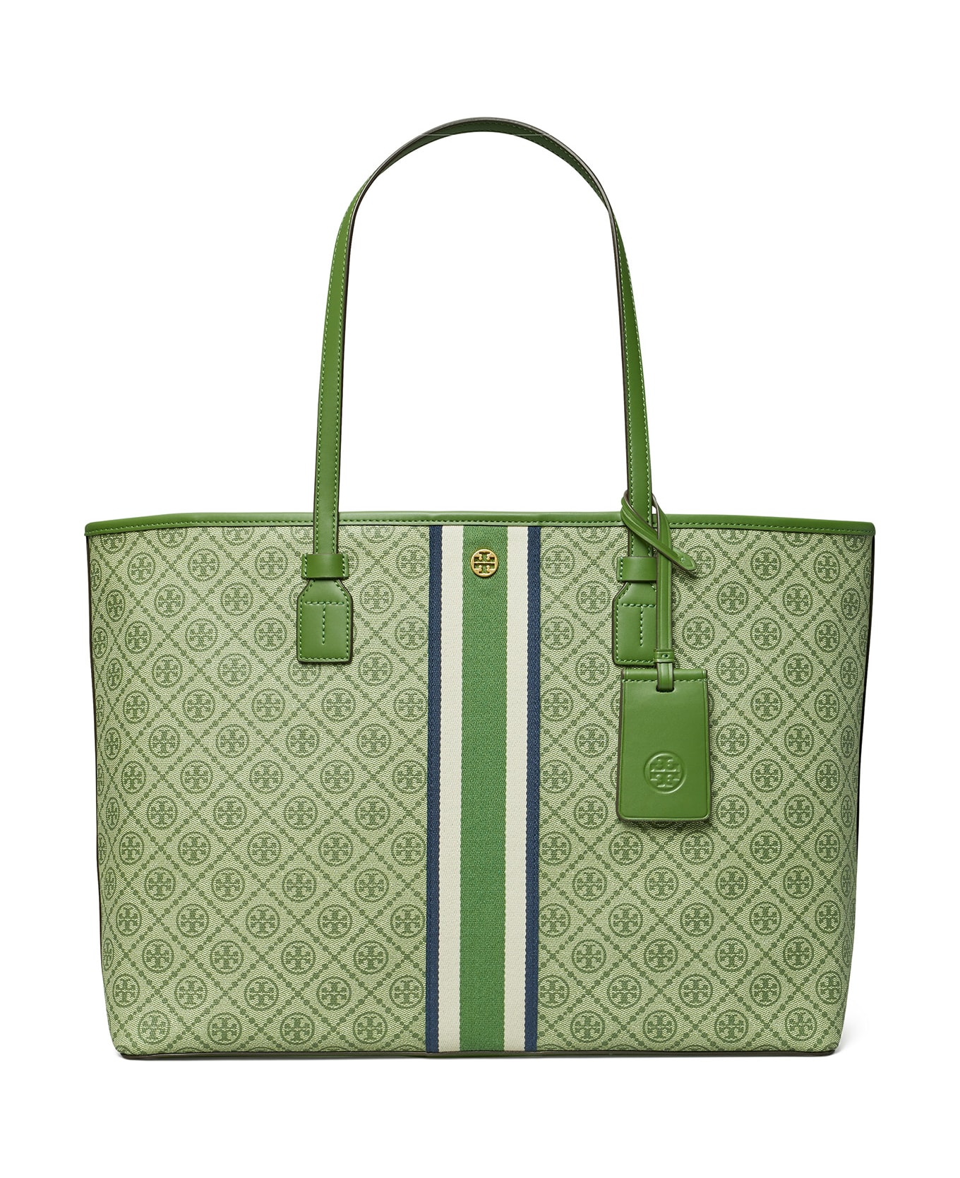 Green tote bag by Tory Burch made of scratch-resistant coated canvas with all-over T monogram motif and eco-leather finishes. For spring 2021, Tory has created the T Monogram, a classic pattern inspired by traditional Pennsylvania Dutch quilting, to celebrate the iconic logo. Model characterized by two handles (23 cm), logoed faux leather detail, single internal compartment, one internal zip pocket, top zip closure, striped insert on the front with iconic double T in metal applied. Metallic details in brass with a golden finish. Offers capacity for a 13" laptop. Protective bag included. 30x29. 5x15. 5 cm
