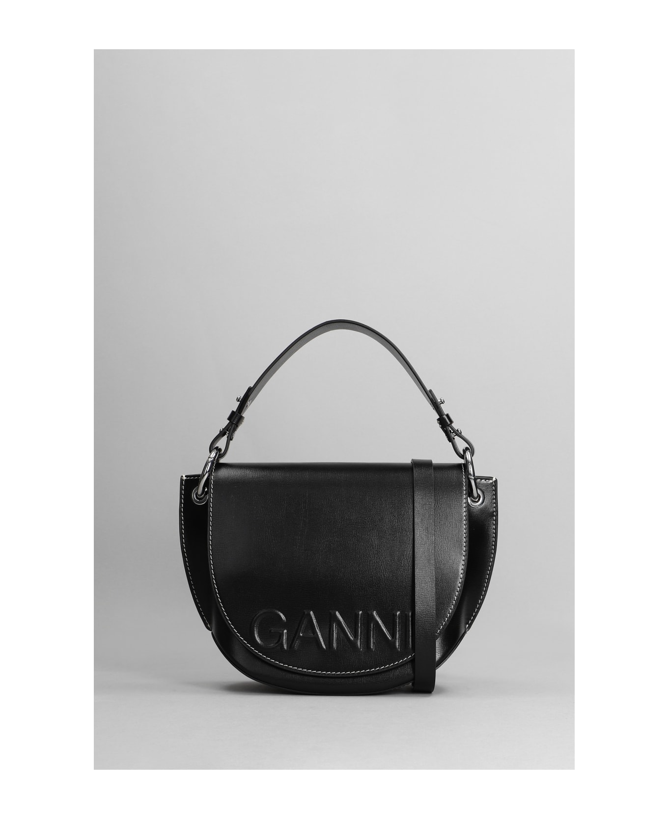 Hand bag in black leather, Height 180 mm, Width 240 mm, handle, shoulder strap, flap closure, relief logo, stitching detail, 100% leather, Made in China