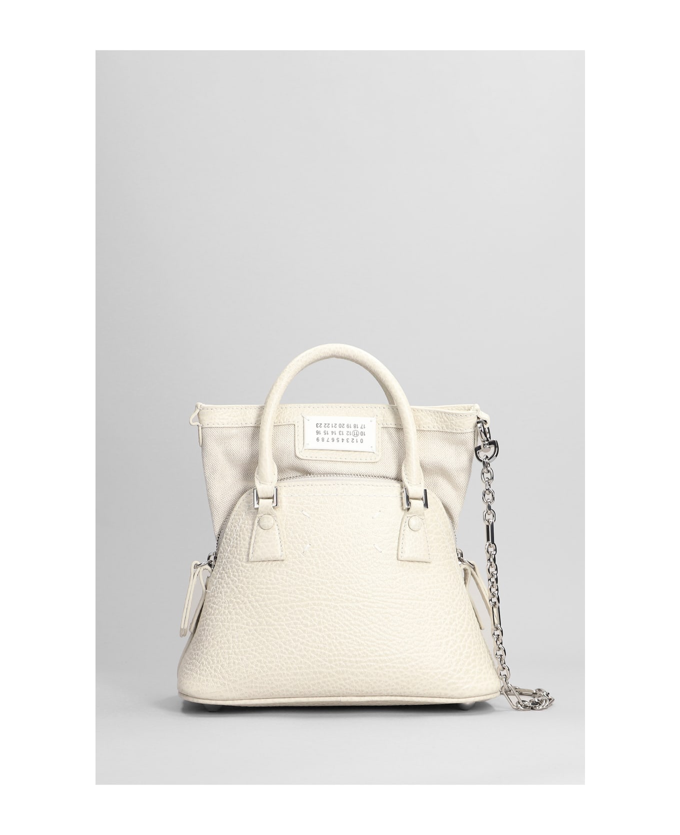 Hand bag in grey leather, double handle, tag logo detail, zip clousure, logo plate, chain shoulder strap, silver hardware, Made in Italy, Height 165 mm, Width 225 mm