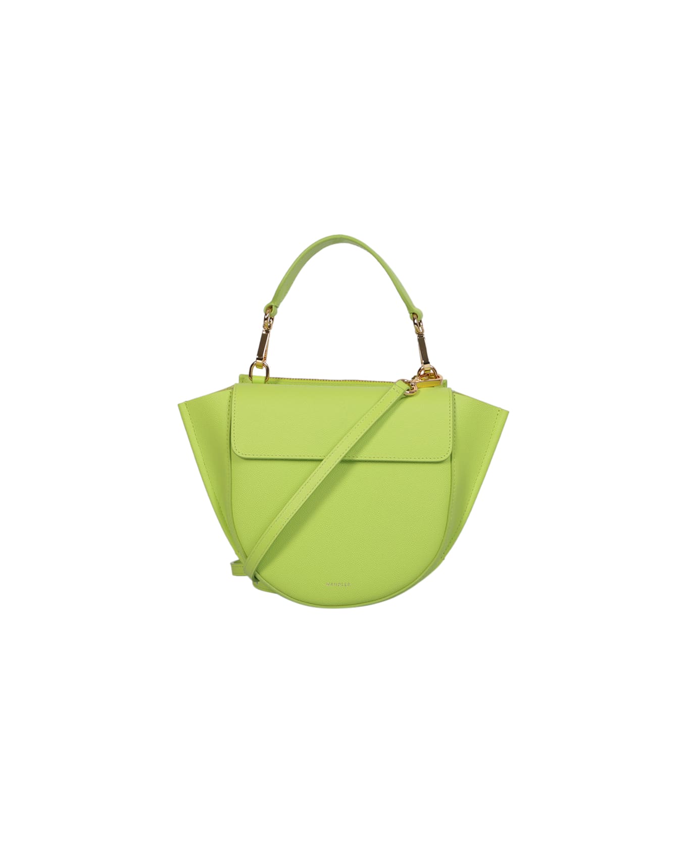 Magnetic fastening. Main compartment. Slip pocket to the rear. Single detachable top handle. Curved edge. Gold-tone lettering. Gold-tone hardware. Colore: lime green