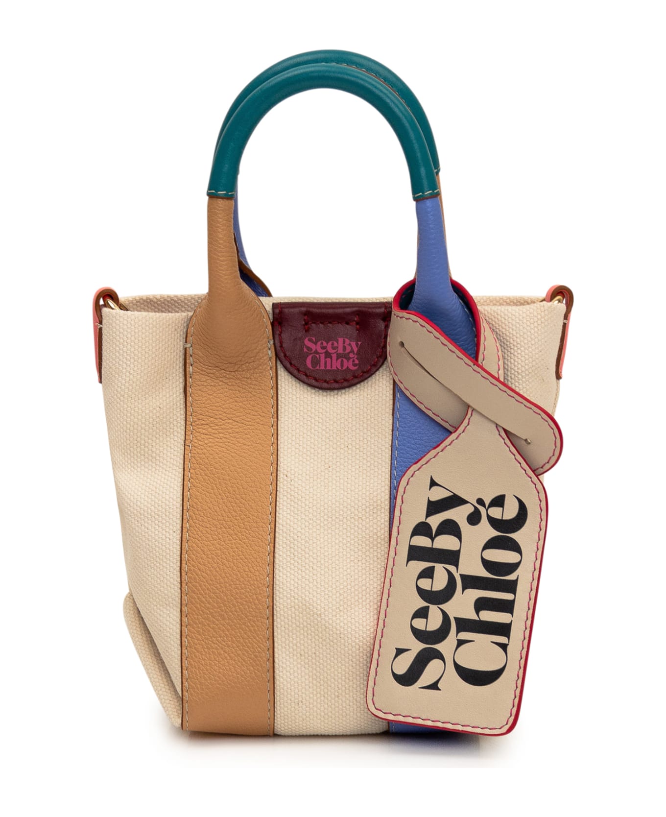 Mini beige bag. Two handles. Removable shoulder strap. Button closure. Two colored bands. Logo on the front.