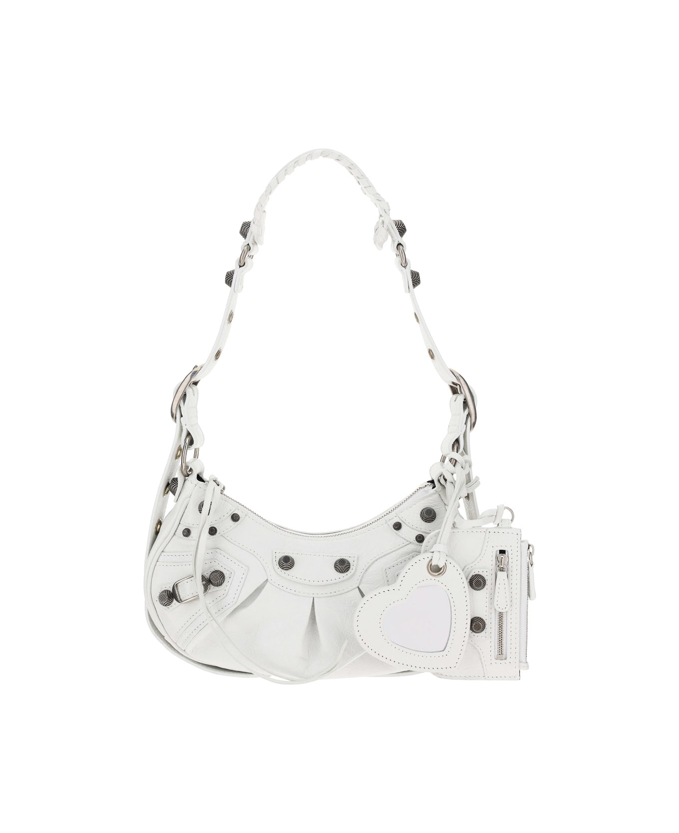 Lambskin le cagole shoulder bag by balenciaga, removable and adjustable leather shoulder strap, zipper closure with knotted leather puller, antique silver studded trim, removable pouch with zipper for opening, a removable heart-shaped mirror, iconic brand signature press-stamped on the back of the mirror, leather tag with iconic brand signature applied in contrasting color inside.