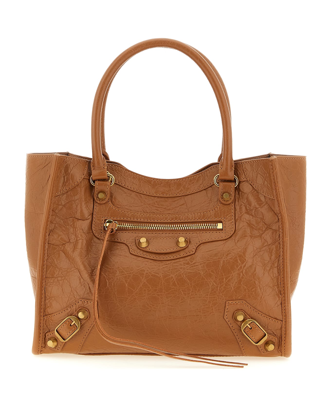 Arena Storico 'Le City' mini lambskin shopping bag with antique gold finish studs, double fixed handle, internal magnetic closure, front zip pocket, cotton canvas lining, adjustable and removable shoulder strap.