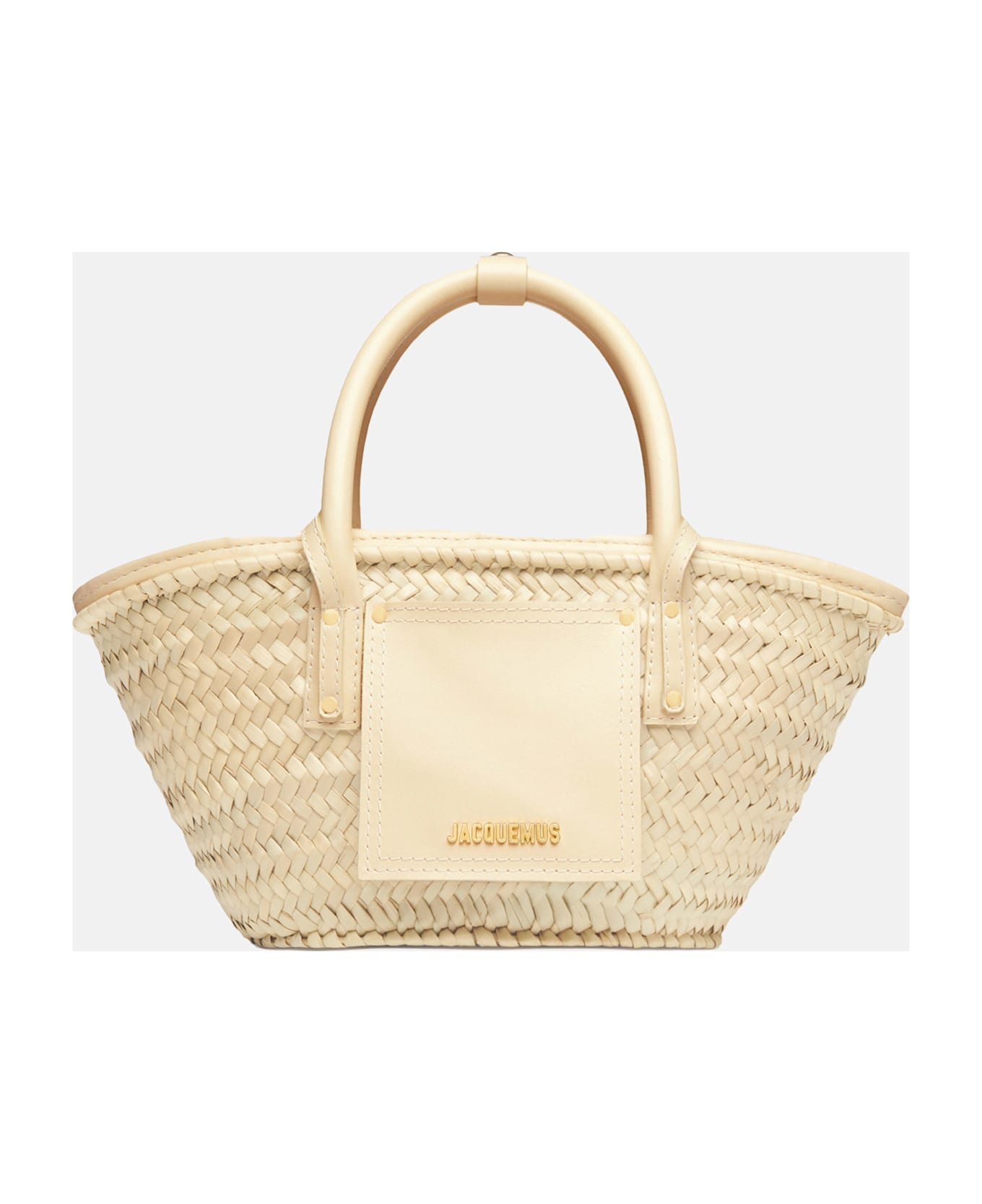 Handwoven mini beach basket bag with smooth leather trims. Soft construction featuring a top handle and a removable long crossbody strap. Wrapped edges and front flap pocket for refined functionality. Gold-tone logo and hardware details. Composition: 100% Other Fibers