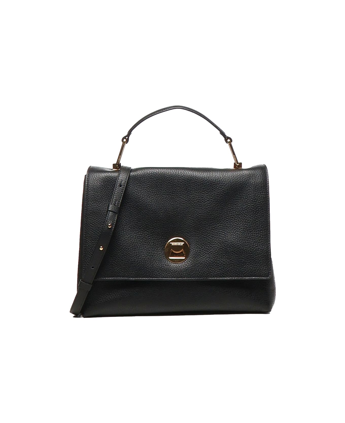 -One back pocket with snap button -Swivel closure -One leather handle -Removable and adjustable shoulder strap -Solid-colored cotton lining -Zip pocket -Measurements: 30 x 24 x 12 cm -Color: Black