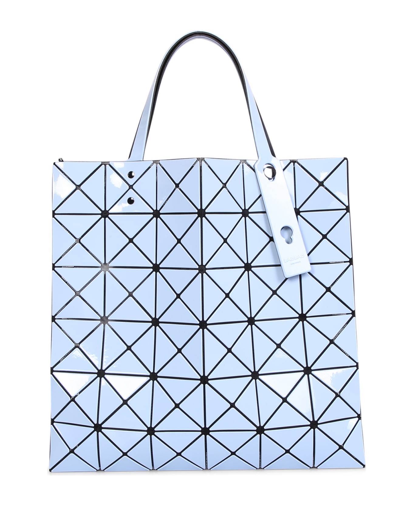 Two top handles. Adjustable handles. Main compartment. Internal logo patch. Full lining. Geometric panelled design. High shine finish. Color: light blue