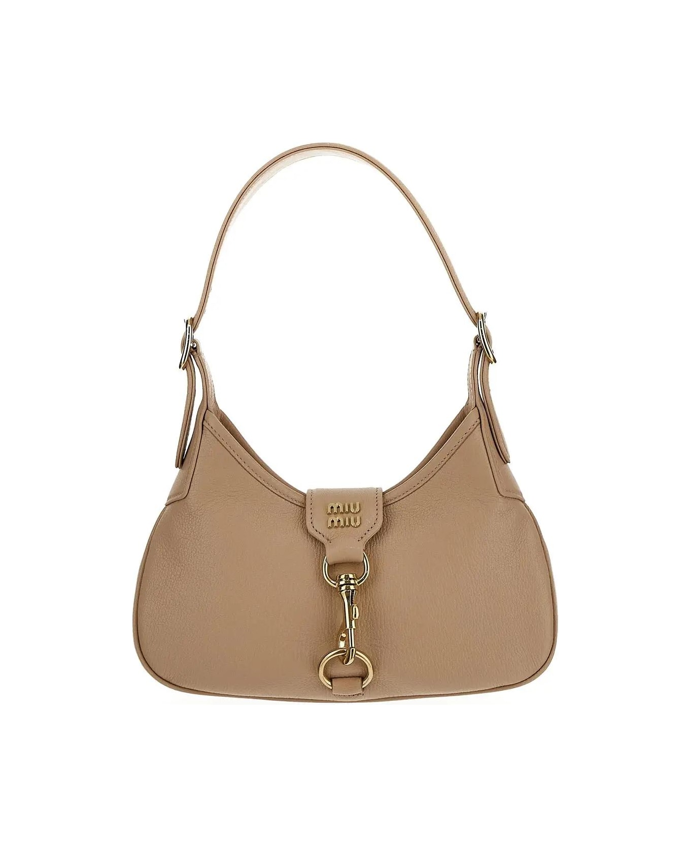 Miu Miu shoulder bag in sand grained leather with adjustable and detachable shoulder strap, flap strap with front antique golden finish metal logo plaque and snap hook closure, a main compartment, an inner zip pocket, an open pocket and antique gold-toned metal hardware.