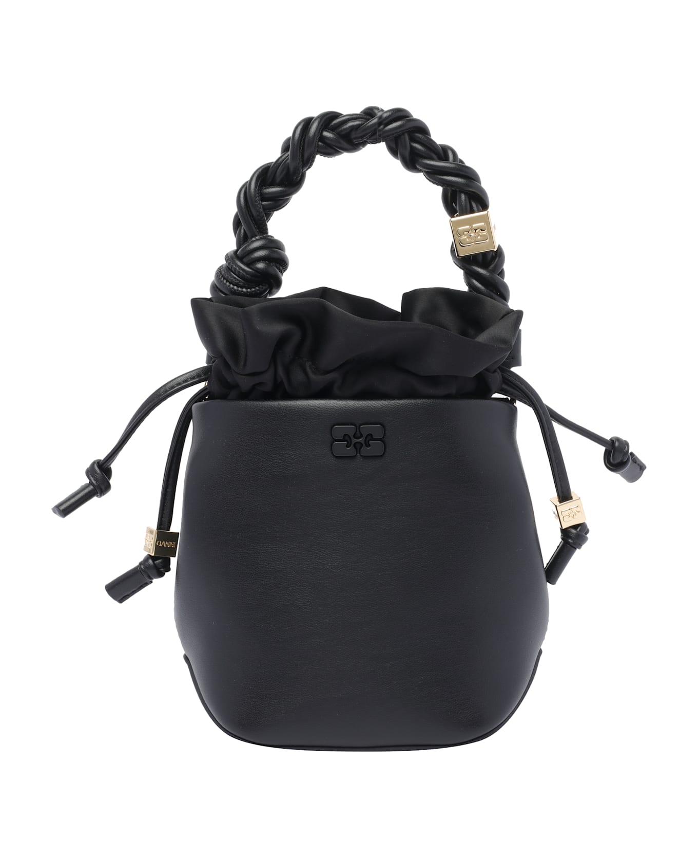 Ganni black mini Bou bucket bag, inner slot, 1 handle, adaptable and removable strap, tone on tone logo, degrade' effect Composition: 65% Calf Leather, 19% Polyurethane, 16% Polyester