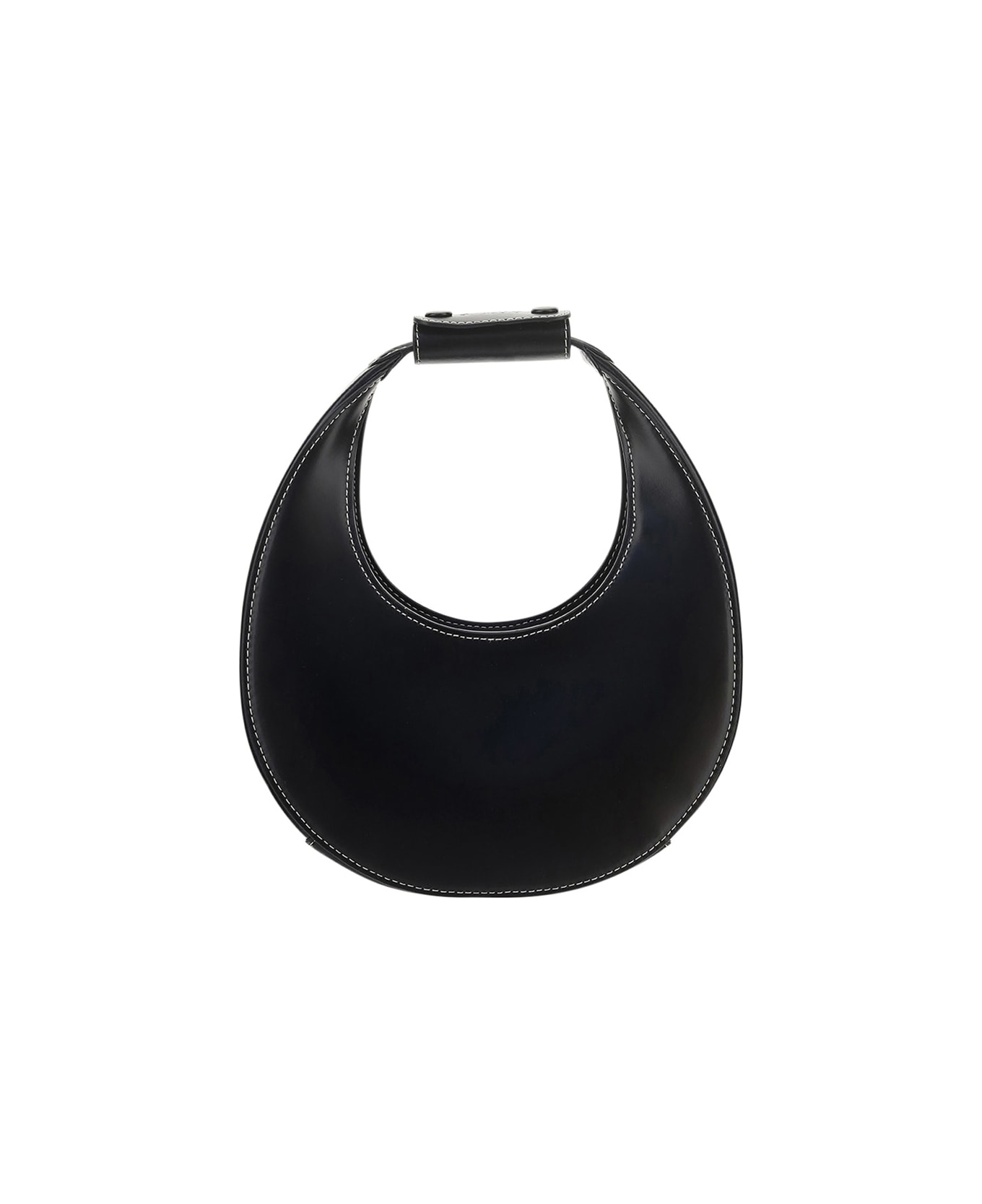 Calfskin mini moon by staud, iconic round moon shape, rigid handle, top closure with magnetic button, iconic brand signature press-stamped on closure flap, interior zippered pocket, removable and adjustable shoulder strap.