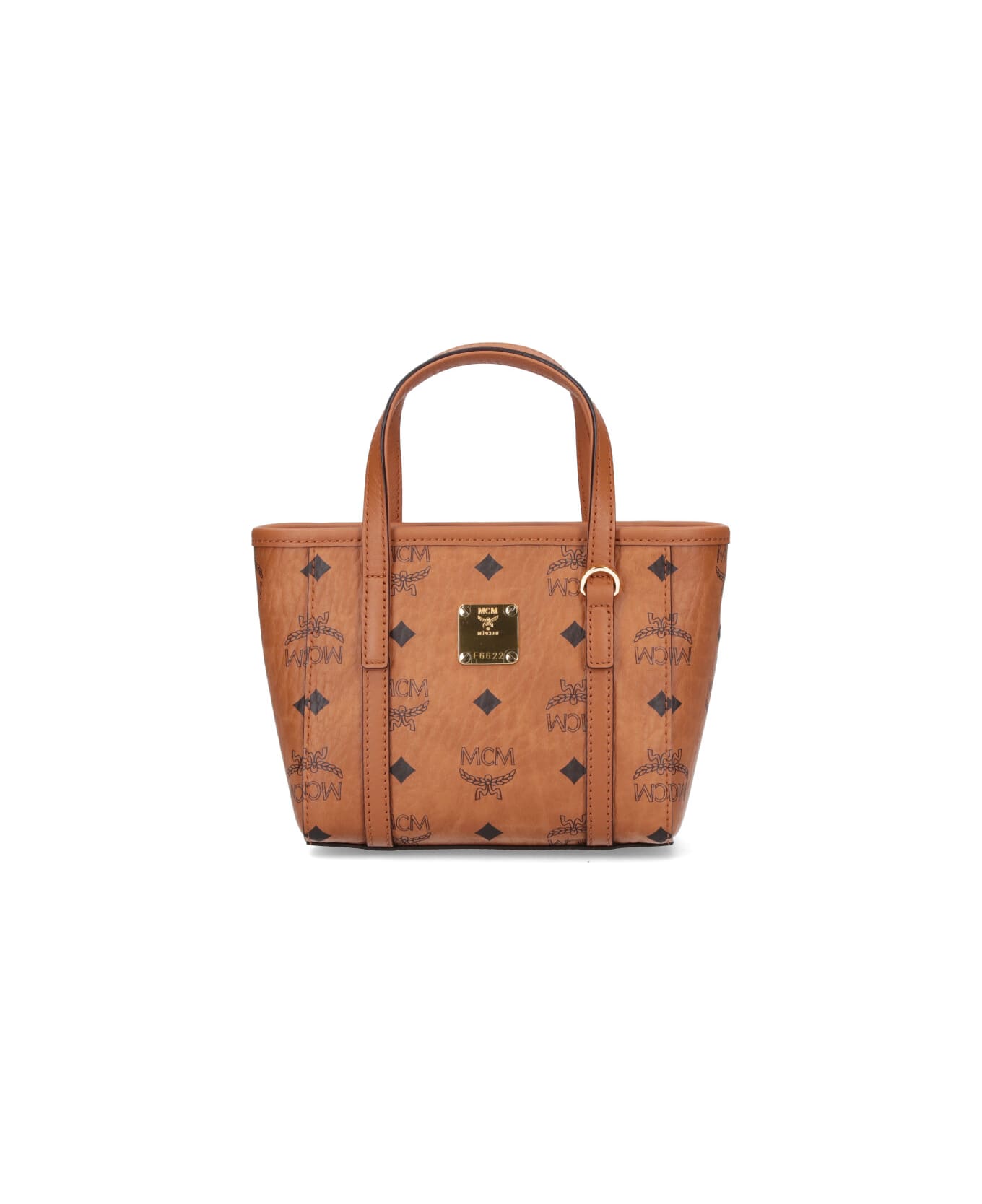 Mini tote bag MCM Toni Top-Zip brown "Visetos" with nappa trim, logo print pattern, two handles, adjustable and removable shoulder strap, zip closure, gold metal logo tag on the front, flat back pocket, inner flat pocket, single inner compartment.
