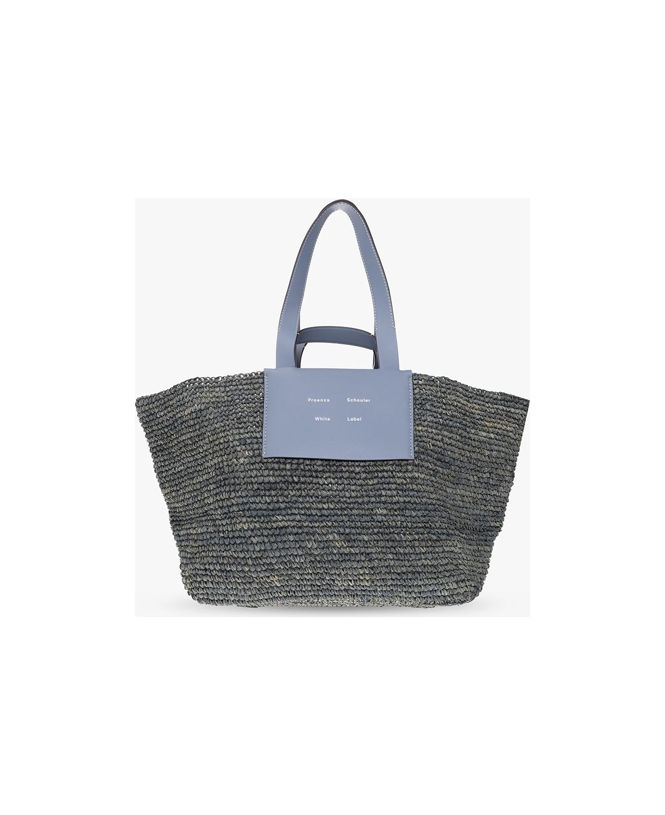 Blue 'Morris XL' shopper bag from Proenza Schouler White Label. Crafted from woven raffia and trimmed with calf leather, this design fastens with a lobster clasp and showcases an embossed white logo on the front, two half-round handles, two straps and one