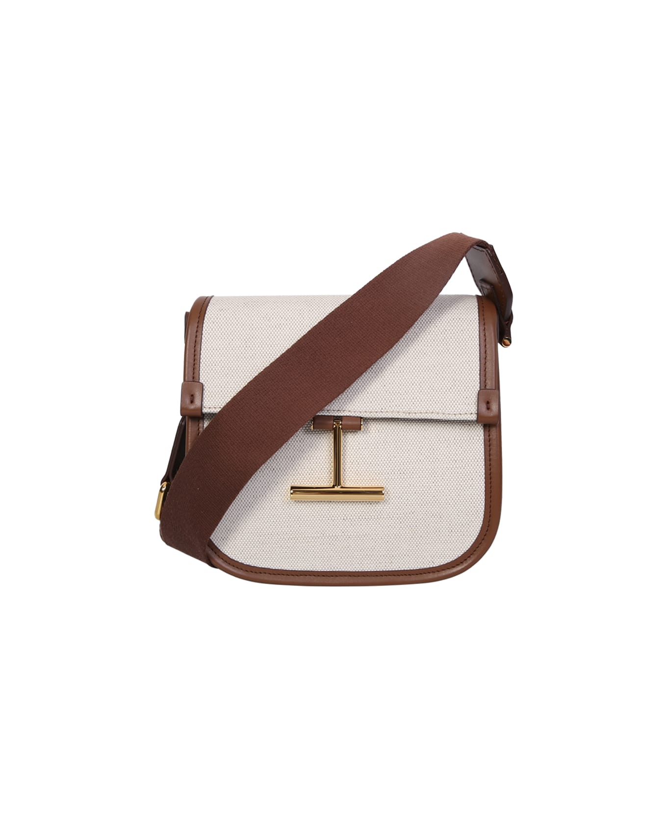 Foldover top. Magnetic fastening. Main compartment. Internal zip fastening. Rear slip pocket. Front logo plaque. Adjustable shoulder strap. Gold tone hardware. Color: white/ brown