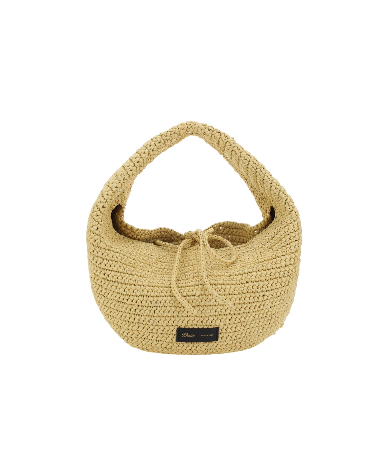 Raffia olivia hobo handbag by khaite, unique design, stiff top handle, closure by raffia ribbons to tie, single interior compartment, contrasting embroidered iconic brand monogram patch on front. Composition: 100% % Viscose